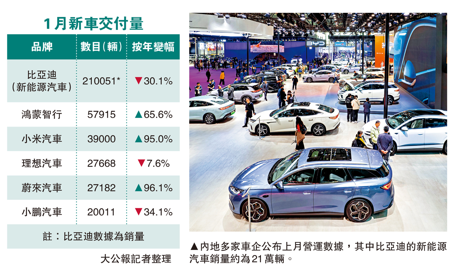 電動車企龍頭比亞迪股份(01211)新能源汽車1月產量達23.2萬輛,按月減少44.7%,按年跌29.1%;銷量約21萬輛,按月跌50%,按年減少30.1%;出口新能源汽車合計超10萬輛,按年增長51.47%。