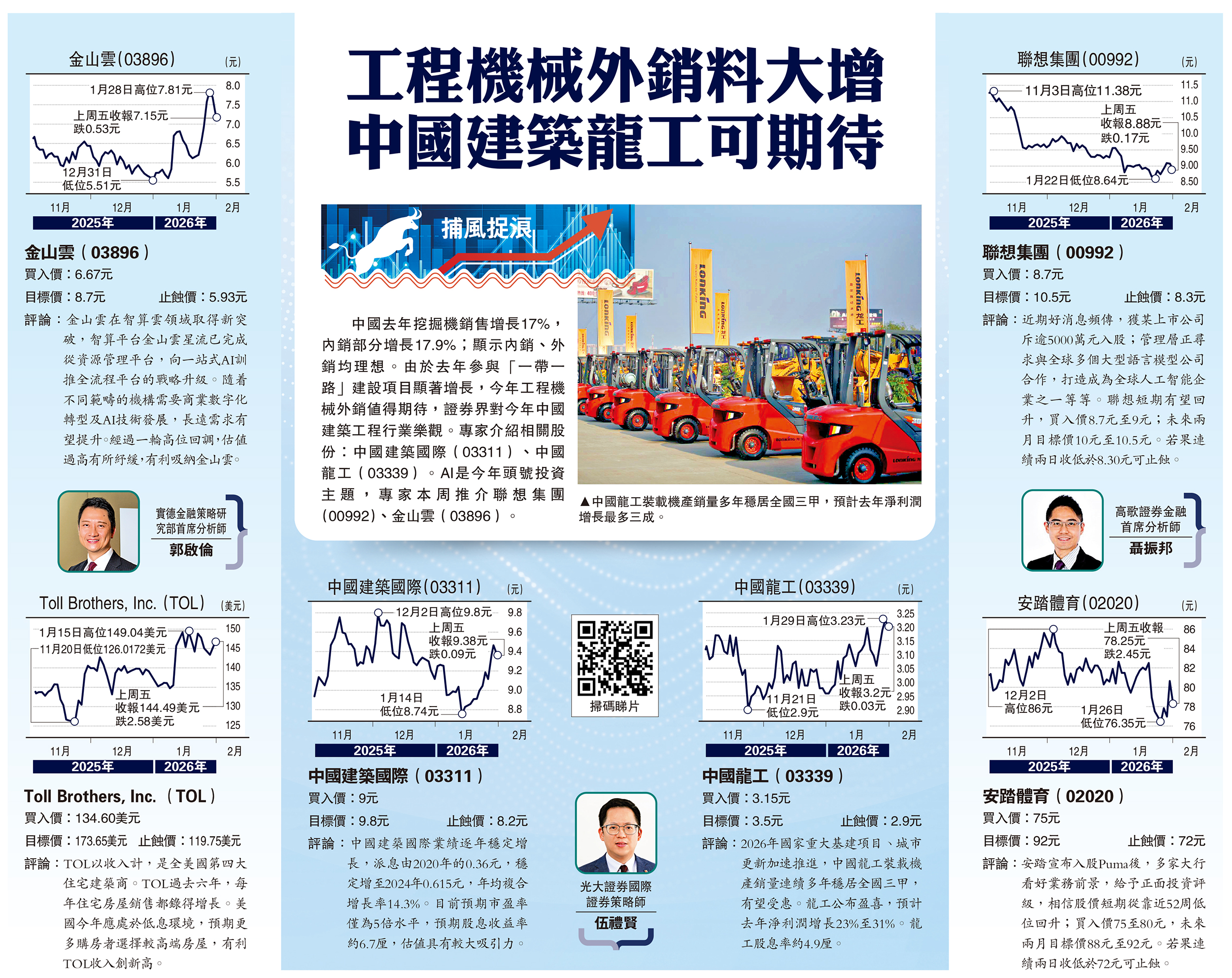 中國去年挖掘機銷售增長17%,內銷部分增長17.9%;顯示內銷、外銷均理想。由於去年參與「一帶一路」建設項目顯著增長,今年工程機械外銷值得期待,證券界對今年中國建築工程行業樂觀。專家介紹相關股份:中國建築國際(03311)、中國龍工(03339)。AI是今年頭號投資主題,專家本周推介聯想集團(00992)、金山雲(03896)。