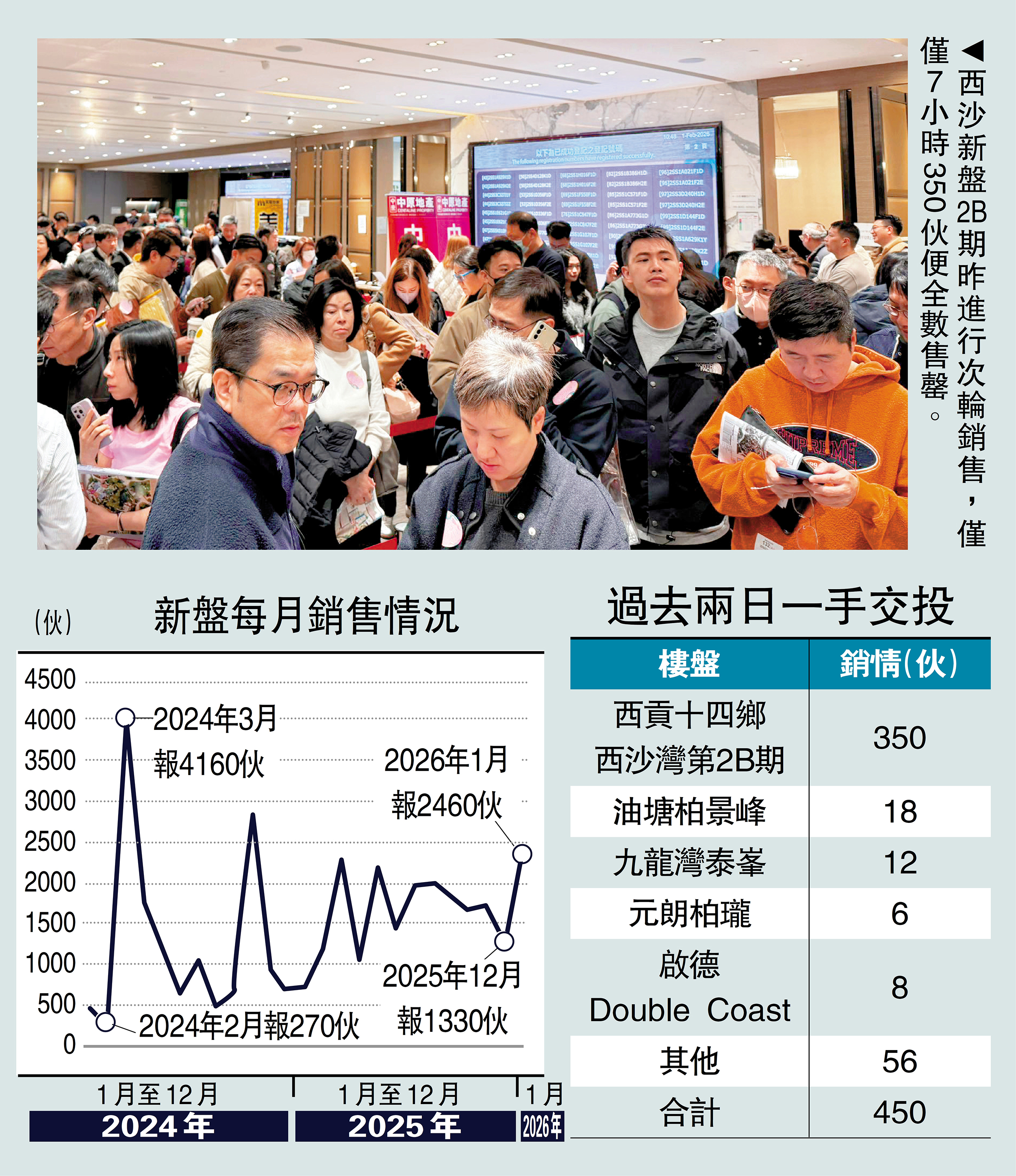 西沙灣第2期為今年首個推售的大型新盤,共提供超過1500個單位。為靈活調節銷售策略,新地將該盤分為2A及2B期推售。上月先推出2A期,隨後於月底加推2B期,兩期每次公開發售均告沽清。昨日展開2B期次輪銷售,涉及350個單位,經過約7小時銷售,單位全數售罄,並持續吸引投資者入市。該批350伙單位折實售價介乎約460.1萬至973.6萬元,折實呎價約10168至14311元,平均折實呎價為12469元。