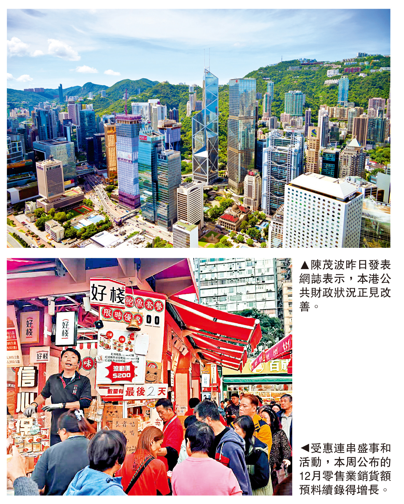 新一份財政預算案將於本月25日發表。財政司司長陳茂波昨日發表網誌表示,本港公共財政狀況正見改善,無論綜合賬目或反映經常收支的經營賬目均轉佳。受惠於金融市場暢旺及財政整合控支,政府經營賬目將於本財政年度(2025至26年度)恢復盈餘,較原估提早一年;同時,他預告12月零售業銷售額將續錄增長。
