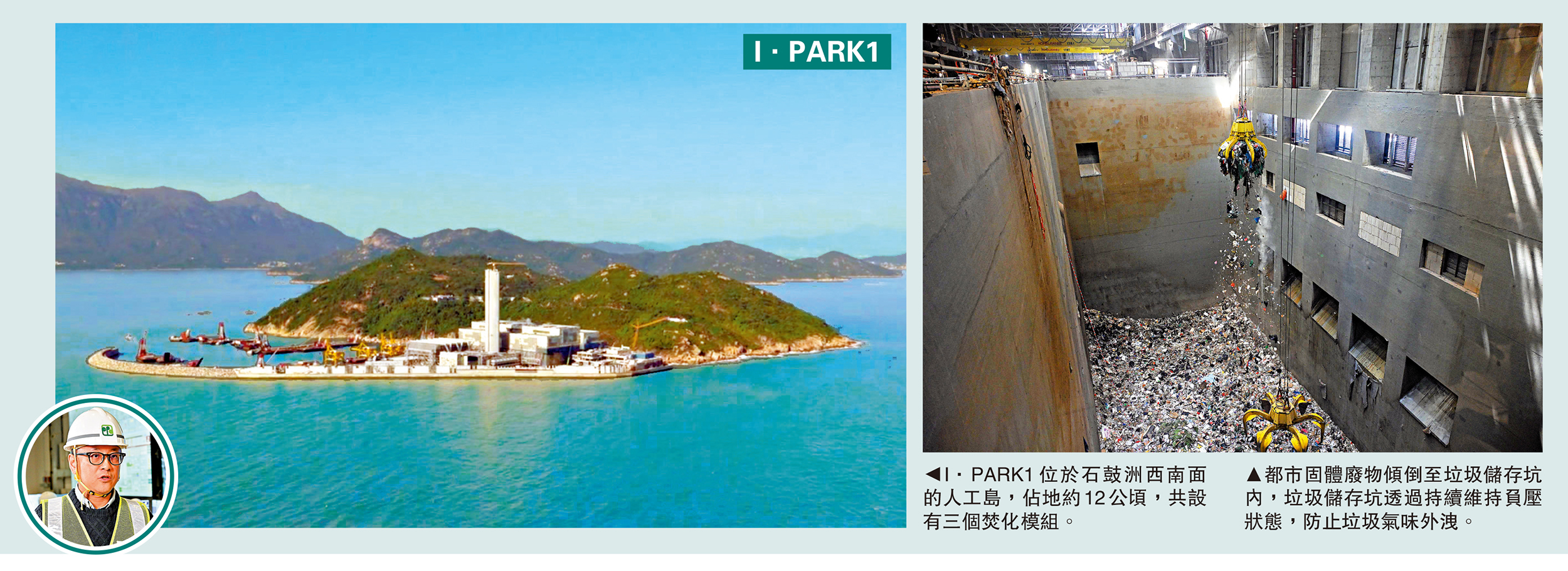 I·PARK1位於石鼓洲西南面的人工島,佔地約12公頃,共設有三個焚化模組。第一個焚化模組已於去年12月試行運作,其餘兩個模組預計於今年第一季起陸續進行系統測試和試運。當所有模組全面投入運作後,設施每日可處理約3000公噸都市固體廢物,每年可向公眾電網輸出約4.8億度電,相等於十萬戶家庭一年的用電量。