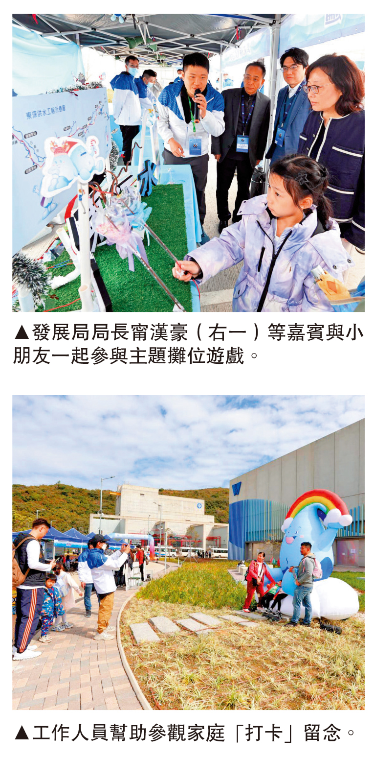 【大公報訊】記者鄭文迪報道:將軍澳海水化淡廠昨日舉行東江水供港六十周年同樂日,現場設有多個遊戲攤位和展板,向市民講解東江水供港歷史和本港食水來源,活動吸引逾2000名公眾人士到場參與。有家長帶同子女參觀,希望讓子女了解香港的食水來源。發展局局長甯漢豪致辭時表示,現時東江水佔全港食用水量達七至八成,支撐經濟民生,讓港人安居樂業。發展局和水務署會繼續透過公眾和校園教育宣傳「飲水思源」的愛國信息,讓市民及學生感念國家對香港的關愛。