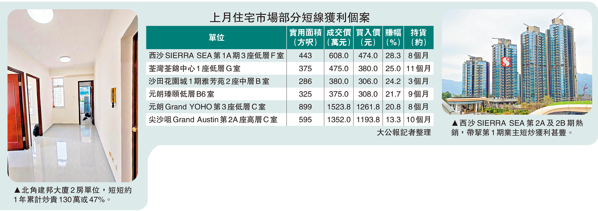 樓市交投暢旺且升溫,造就短炒獲利頻現,《大公報》綜合代理資訊,上個月已知住宅短線轉手獲利成交96宗,按月飆升逾1.6倍,樓價400萬元內上車盤則成為炒家天堂,其中樓齡38年的北角單幢樓建邦大廈,有2房單位約1年間3度短炒,樓價由「2字頭」炒至突破「4球」,短短約1年炒貴130萬元或47%。\大公報記者 林惠芳
