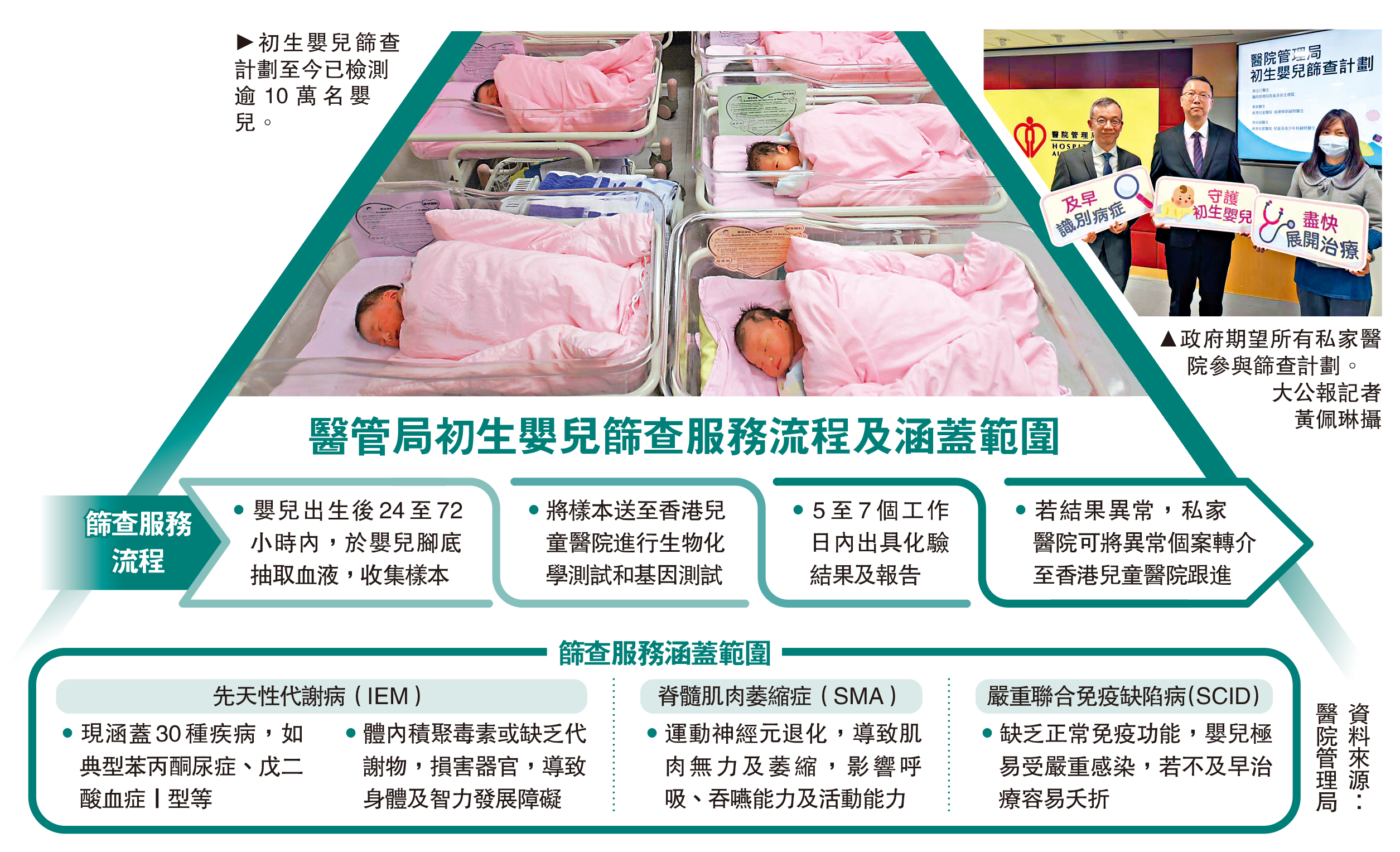 醫管局的初生嬰兒篩查計劃至今已為超過10萬名嬰兒做檢測,共檢測出48宗病例,準確率達99%。\大公報記者 黃佩琳