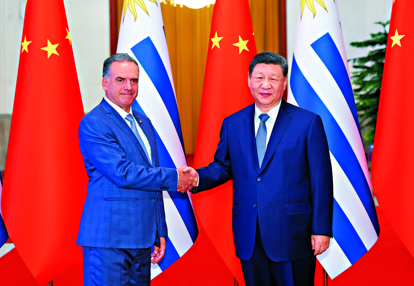 習近平指出,當今世界正處於百年未有之大變局,國際形勢變亂交織,單邊霸凌愈演愈烈,中方支持烏拉圭接任「77國集團和中國」輪值主席國,願與烏方加強全球南方團結協作,共同推進平等有序的世界多極化、普惠包容的經濟全球化,攜手並進、共謀發展,為構建人類命運共同體作出更大貢獻。中方始終重視中拉關係,支持拉美和加勒比國家維護自身主權、安全、發展利益,支持烏拉圭接任拉美和加勒比國家共同體以及南方共同市場輪值主席國,願同烏方和地區國家推動共建中拉命運共同體走深走實。