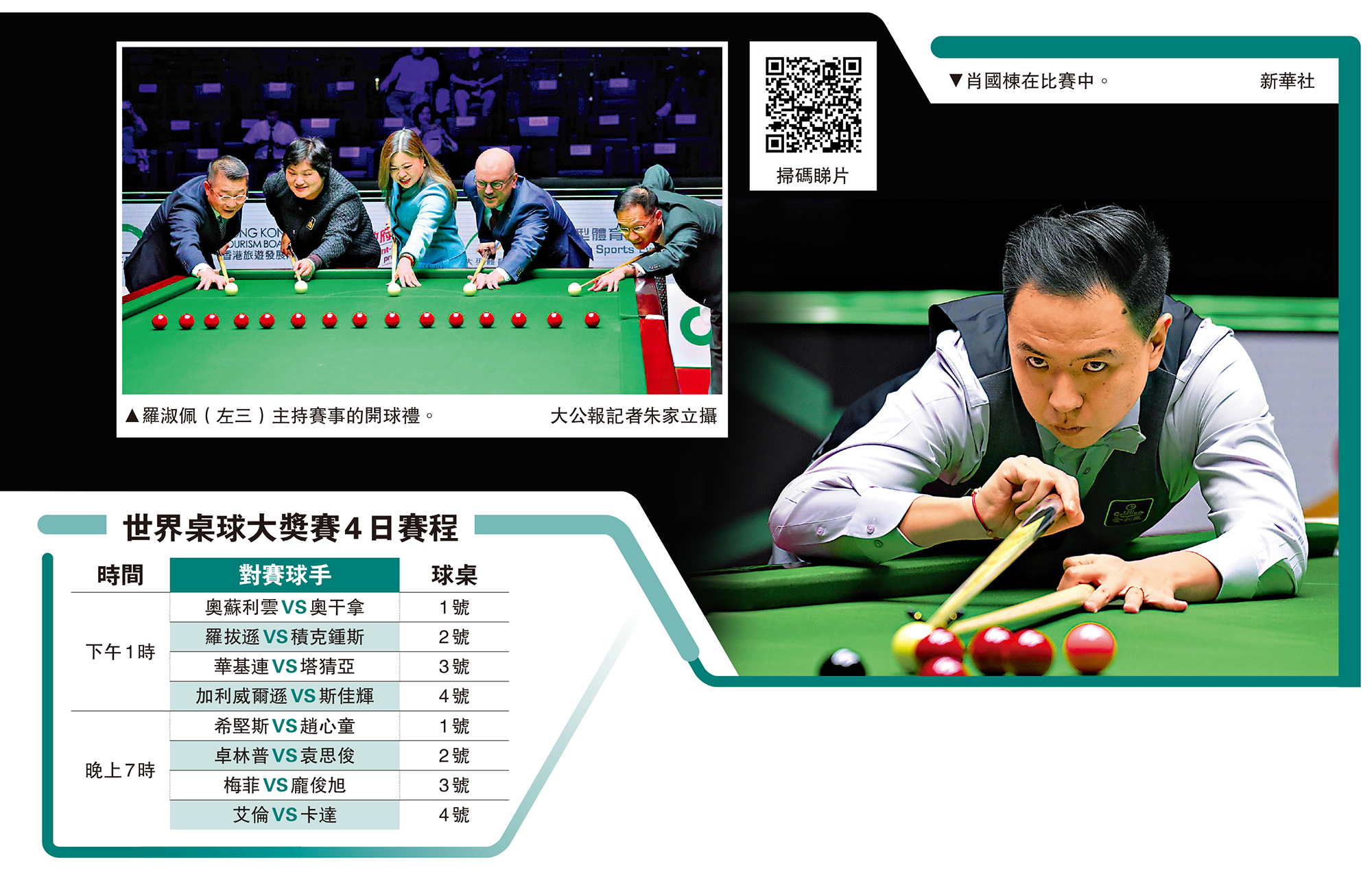 一年一度的世界桌球大獎賽2026昨日(3日)在啟德體藝館展開首日賽事,並由文化體育及旅遊局局長羅淑佩擔任開球主禮嘉賓,包括丁俊暉、肖國棟、周躍龍、常冰玉、張安達、吳宜澤等中國球手在首圈分途上陣,爭奪16強席位。經過首日角逐,肖國棟、周躍龍、張安達、吳宜澤及常冰玉5位好手晉級,其中肖國棟更以5:2擊敗世界第二的奇連威爾遜,成為首日發揮最為亮眼的中國球手。\大公報記者 朱家立