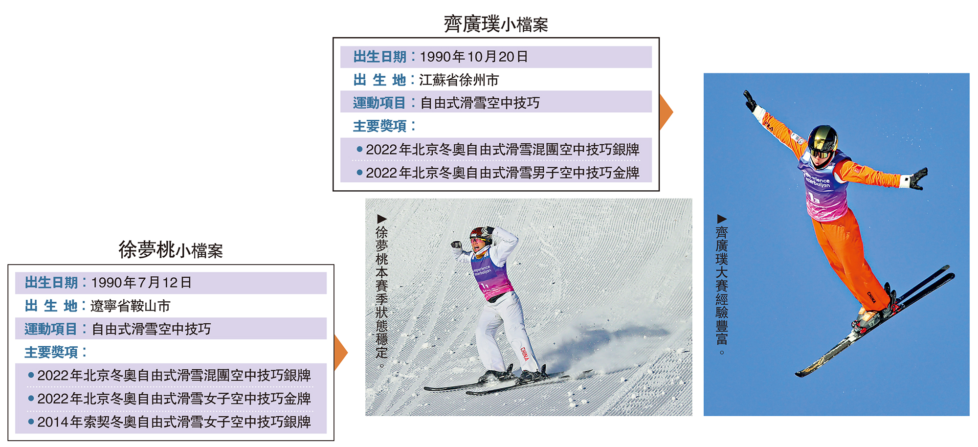 【大公報訊】據新華社報道:空中技巧項目歷來是國家隊的「金牌富礦」。歷屆冬奧上,中國空中技巧隊共斬獲3金7銀4銅。本屆冬奧,隊伍由徐夢桃、齊廣璞兩位「五朝元老」領銜,男女單項均拿到4個滿額參賽席位,目標直指包括混合團體在內的3枚金牌。