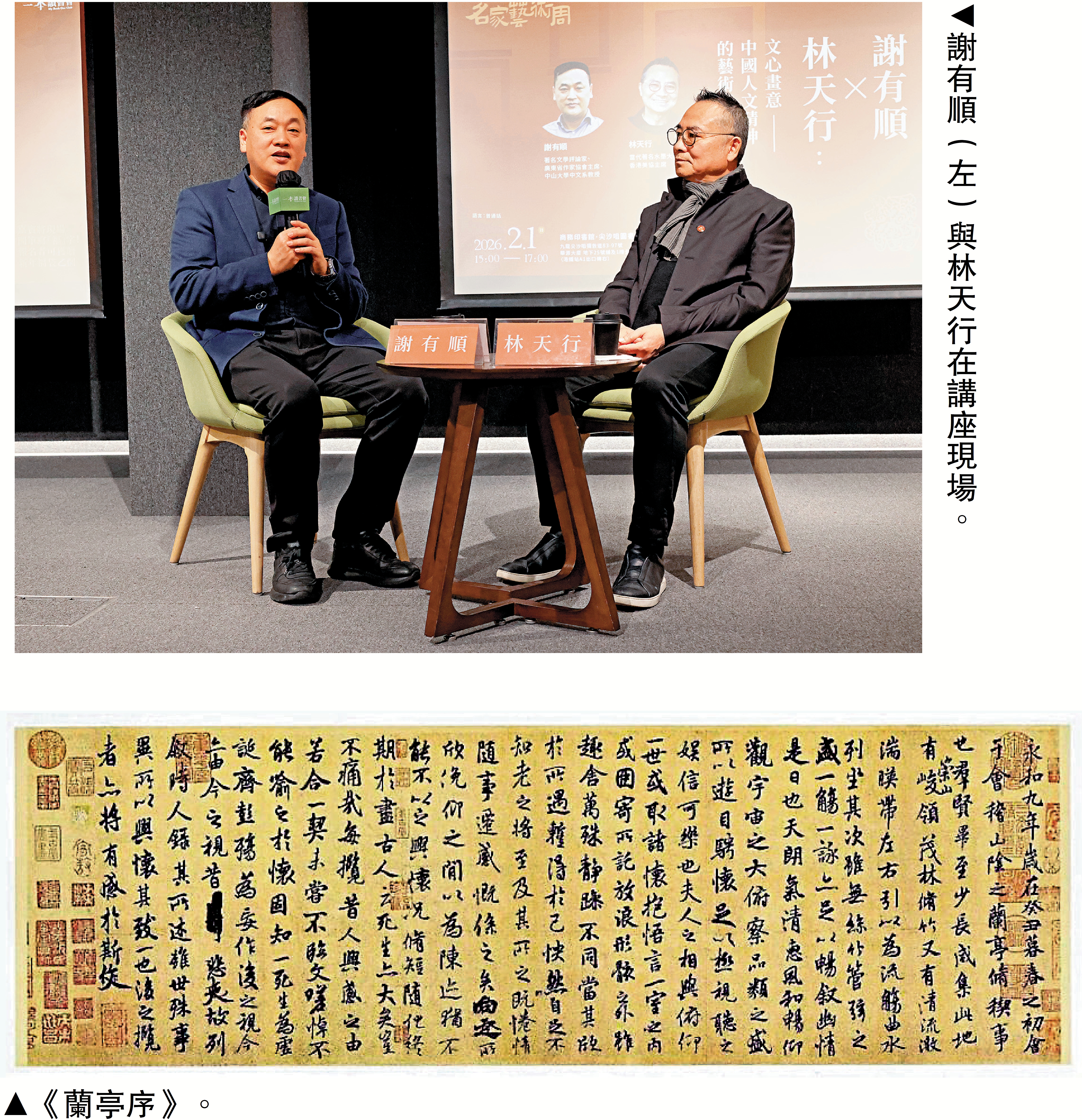 「文心畫意─中國人文精神的藝術表達」是「名家藝術周」新春系列活動的第二場講座。講座由著名作家、文學評論家謝有順,以及畫家林天行主講。兩人分別來自文學與視覺藝術領域,卻在談及中國藝術時,指向同一個核心─「心」。\大公報記者 郭悅盈(文、圖)