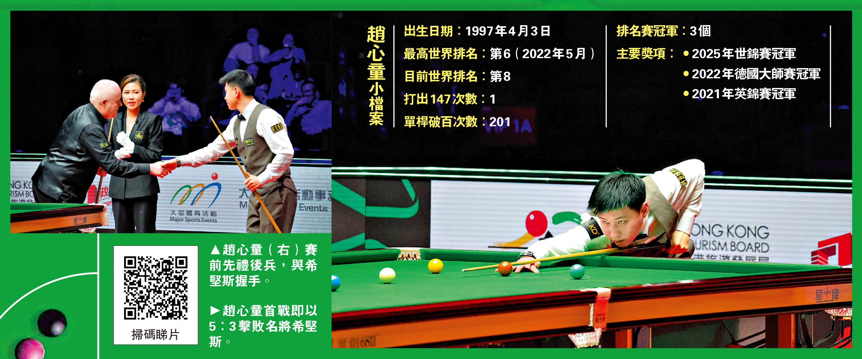 說回賽事,28歲的趙心童在首圈便要對陣「巫師」希堅斯,兩者年齡相差22歲,在世界排名上希堅斯亦較趙心童高出3名,不過兩者皆處於世界排名前10隊列,故今仗鬥得十分激烈。趙心童在出場時便獲得不少現場球迷歡呼聲,更有部分球迷拿出手機跟蹤拍攝他的出場過程。