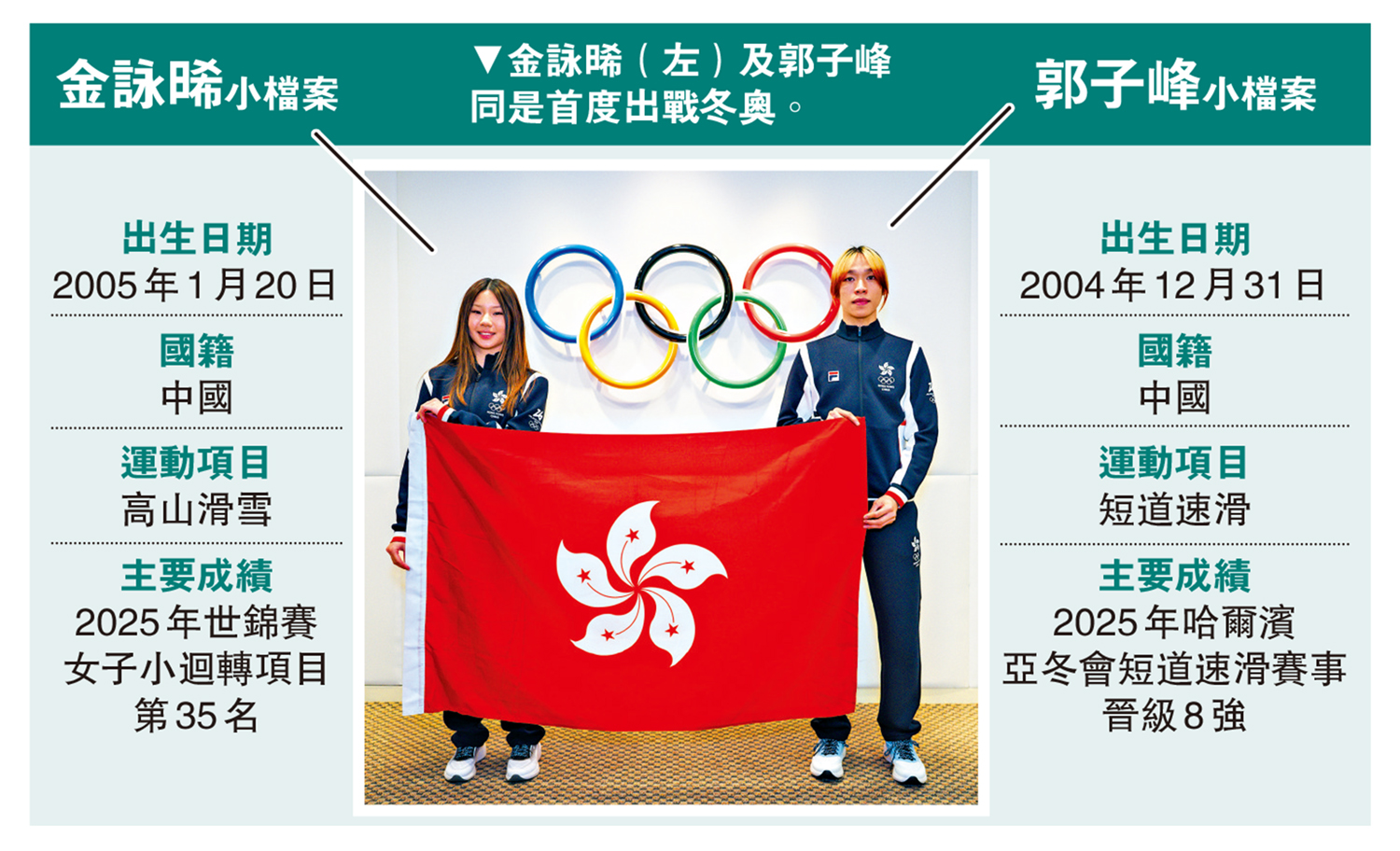 金詠晞於去年世界錦標賽女子小迴轉項目取得第35名,創下港隊歷來最佳成績,將於本屆冬奧出戰高山滑雪女子迴轉項目。郭子峰則於去年哈爾濱亞洲冬季運動會短道速滑賽事晉級8強,他將於個人首次冬奧之旅出戰短道速滑男子1000米及1500米賽事。