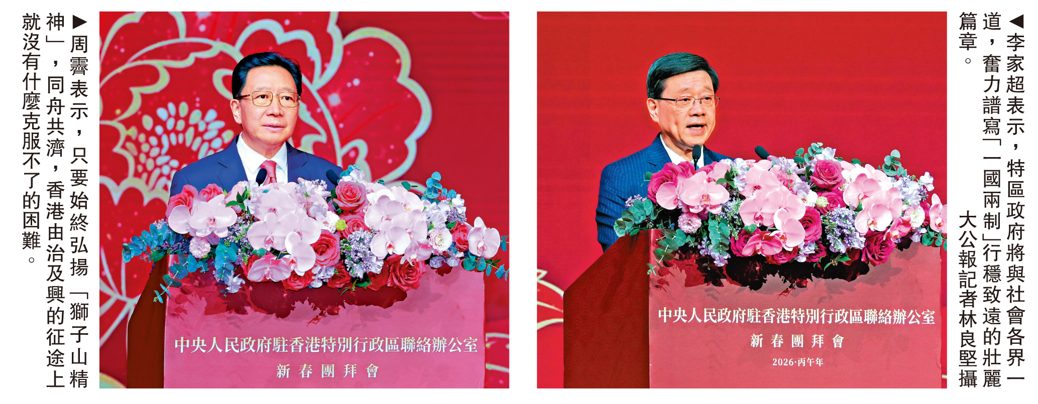 【大公報訊】記者李慧妍報道:香港特區行政長官李家超昨日出席中央政府駐港聯絡辦公室2026年新春團拜會並致辭。李家超表示,2025年香港經濟按年增長3.5%,貨品出口和進口總額分別上升12%,繼續位列全球最自由經濟體,世界競爭力升至第三,人才排名與數碼競爭力升至第四,內地和海外企業的駐港公司達到超過11000家的歷史新高。李家超強調,香港過去一年的成就來自國家堅實支持、特區政府不懈努力及市民團結奮鬥,彰顯「一國兩制」下的制度優勢。踏入丙午馬年,特區政府將主動對接國家發展戰略,深化國際交往合作,譜寫「一國兩制」行穩致遠的新篇章。