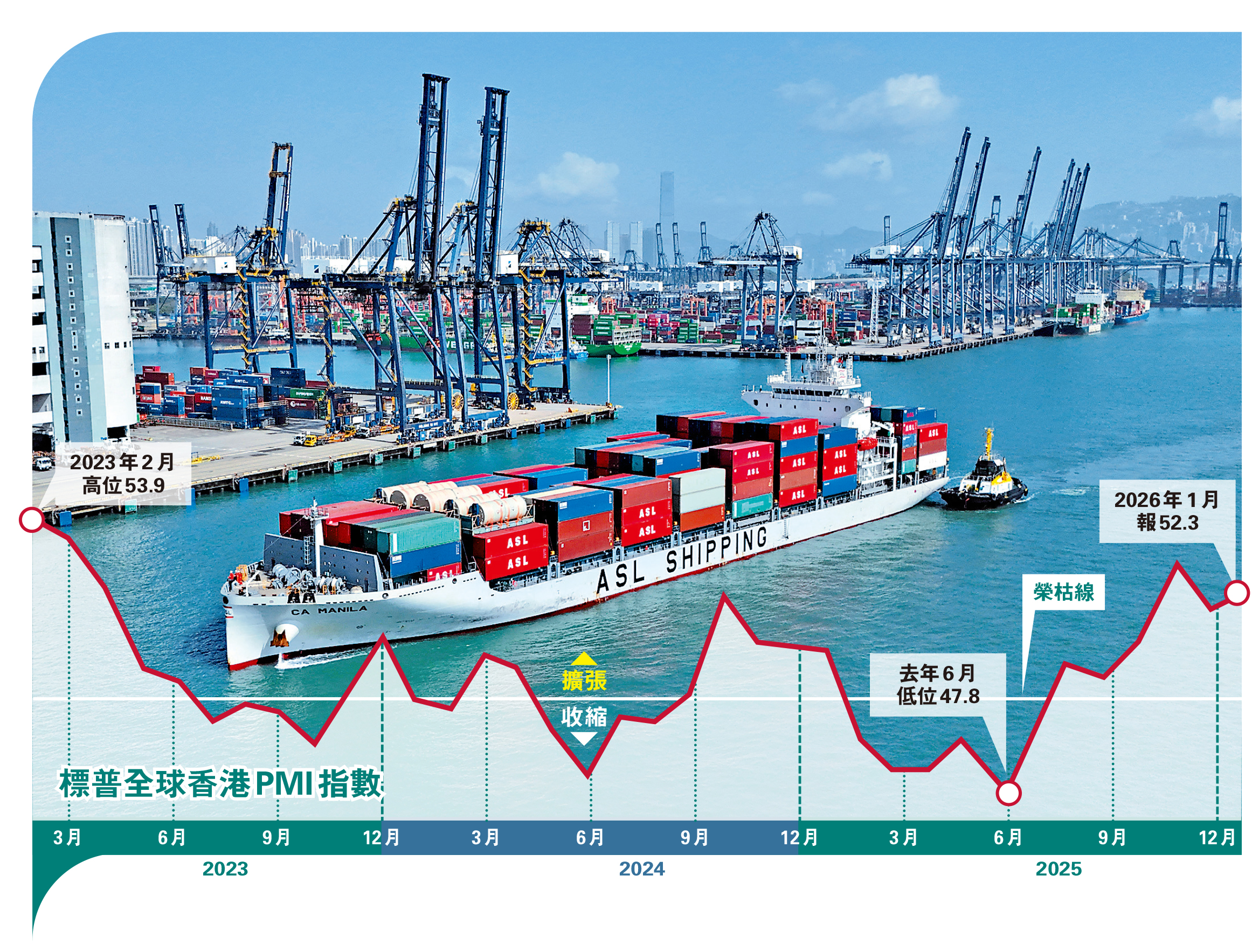 受惠市況向好,今年1月標普全球香港PMI指數按月升0.4至52.3,連續6個月處於擴張區間,反映香港營商環境持續有力好轉。值得注意的是,新出口訂單創2023年3月以來最大增幅。香港付貨人委員會主席許彼得表示,今年農曆新年比較遲,且原材料價格呈上升趨勢,買家擔心稍後加幅更多,兩個疊加效應導致價量齊升。\大公報記者 李永青