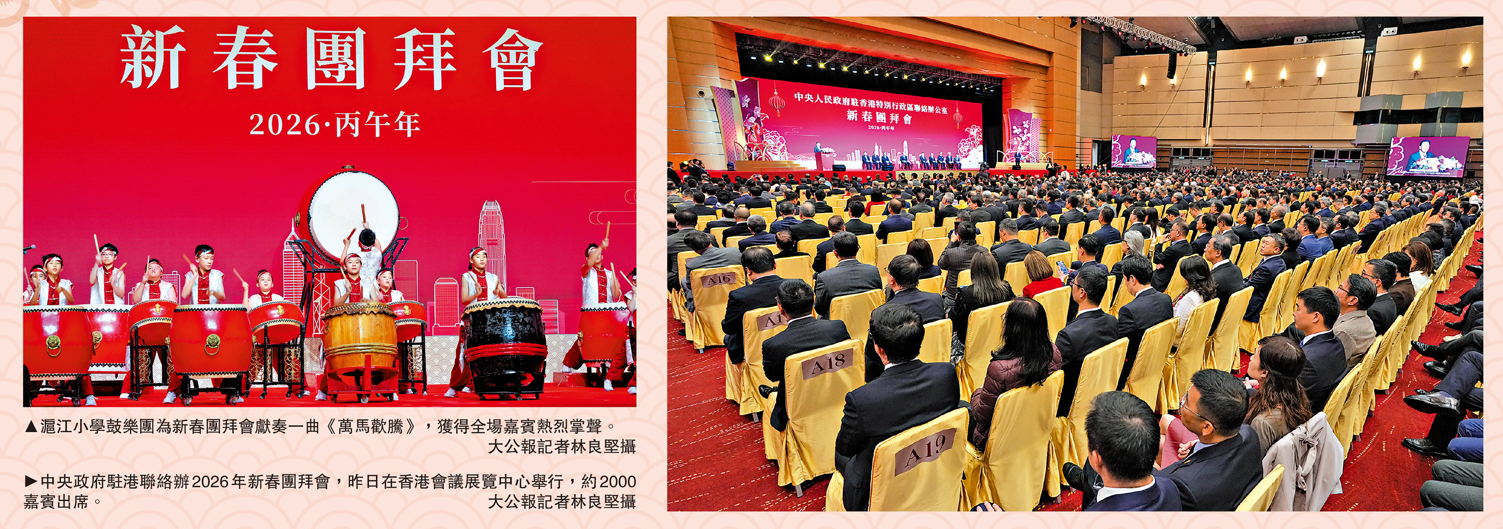 中央政府駐港聯絡辦2026年新春團拜會昨日於香港會議展覽中心舉行,中央人民政府駐香港特別行政區維護國家安全公署署長董經緯、外交部駐港公署特派員崔建春、中國人民解放軍駐香港部隊副司令員譚志偉先後致辭,回顧過去一年香港由治及興的積極進展,展望「十五五」規劃開局之年在「一國兩制」下對接國家戰略、深化國際合作、維護國家安全、推動經濟民生與長期繁榮穩定的重點工作,並向祖國與香港送上新春祝福。\大公報記者 李慧妍、吳俊宏