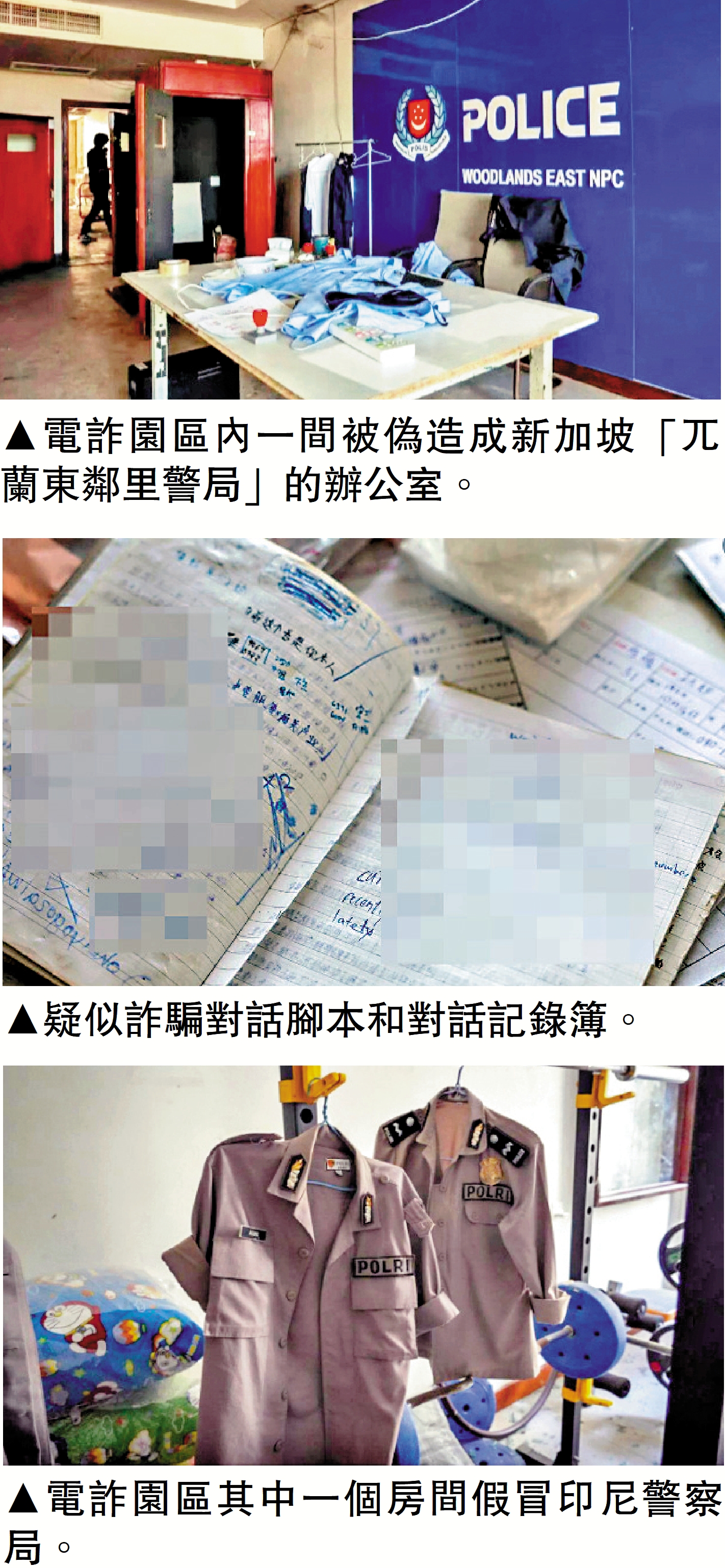 同時,多個房間被布置成不同國家的「警察辦公室」,涉及的國家分布範圍涵蓋亞洲、南美洲、大洋洲等。其中一間明確標示為「兀蘭東鄰里警局」,室內擺放疑似新加坡警察部隊的徽章及制服。