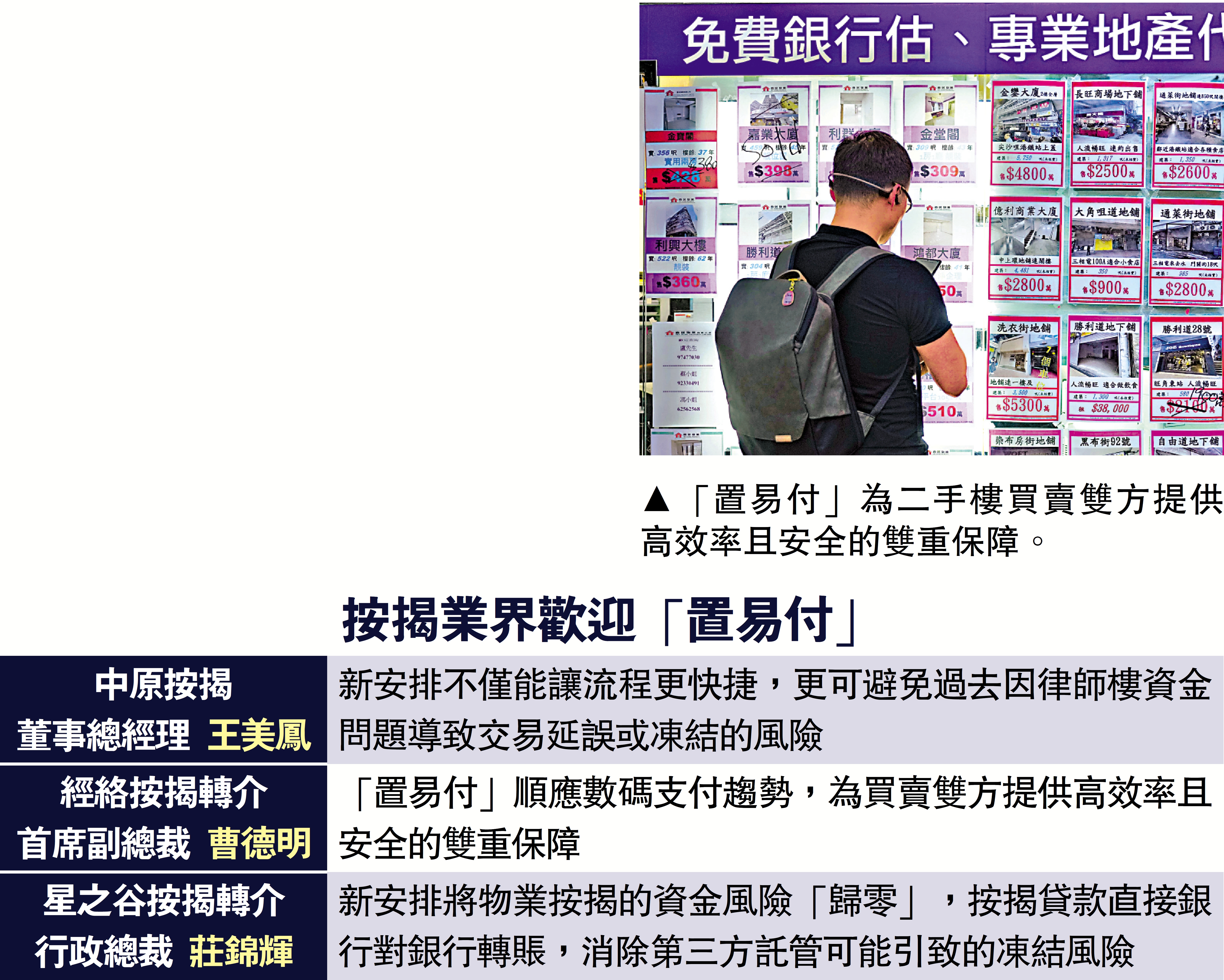 中原按揭董事總經理王美鳳指出,新安排下,買方的按揭金額將透過即時支付結算系統(CHATS)直接由銀行轉賬至賣方銀行戶口,毋須再經律師樓處理大額款項。這不僅讓流程更快捷,更可避免過去因律師樓資金問題導致交易延誤或凍結的風險。王美鳳稱,「置易付」自2022年11月推出以來,在轉按交易中已運作順暢,相信二手買賣客戶在了解其保障後,將樂於採用。