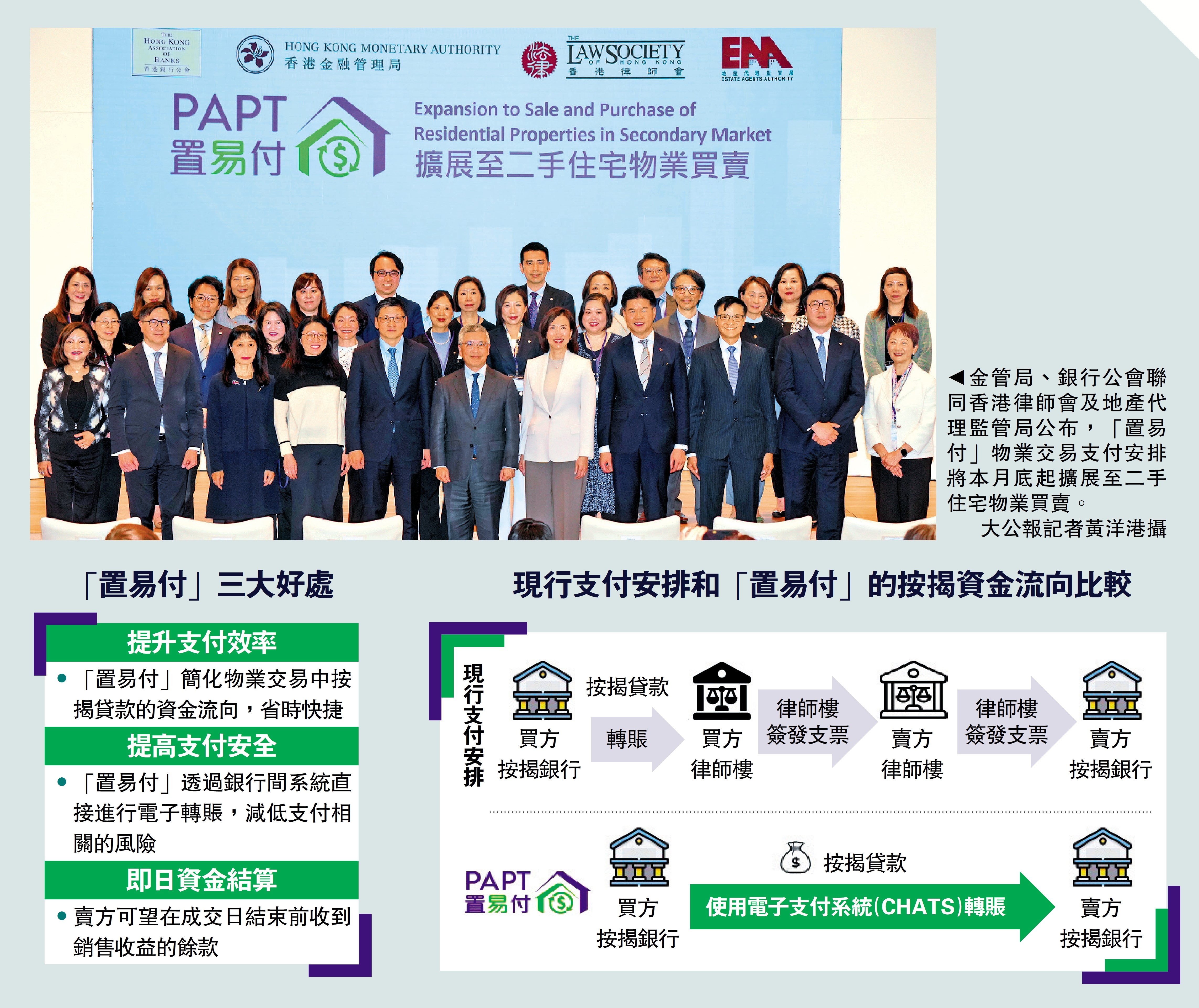 香港金融管理局、香港銀行公會、香港律師會、地產代理監管局昨日聯合公布,由2月28日開始,所有提供住宅樓宇按揭的持牌銀行會將新的電子支付安排擴展至二手住宅物業買賣。新服務正式命名為「置易付」,方便市民識別。