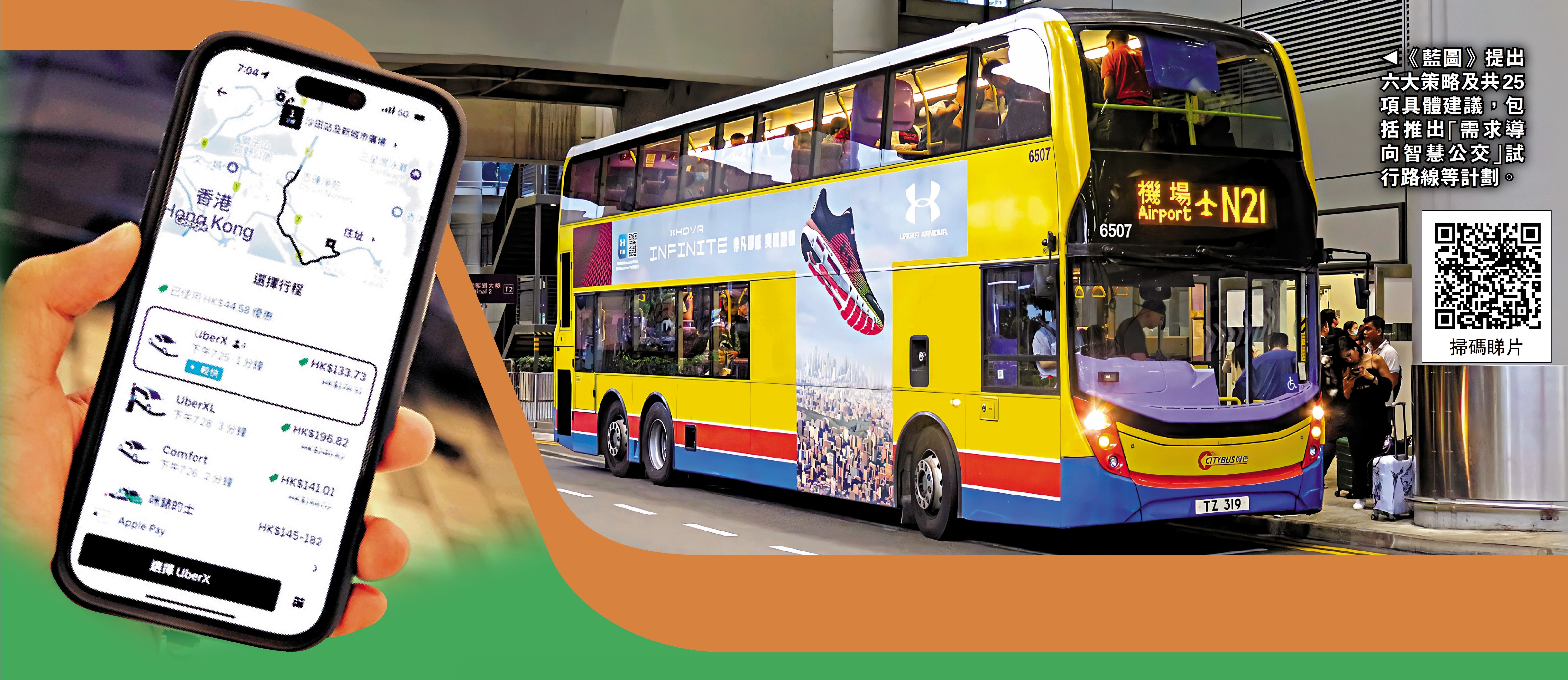 特區政府運輸及物流局昨日公布《運輸策略藍圖》(《藍圖》),提出六大策略及共25項具體建議,前瞻未來20多年本港交通運輸的發展願景,包括「八縱八橫」基建新布局,強化AI在交通管理應用。《藍圖》提出今年會有10項重點措施,包括推出「需求導向智慧公交」試行路線,類似預約「併車」概念,乘客於應用程式預約行程需求,巴士公司按需求調派車輛,適用於專營巴士的機場通宵線和觀光巴士線。