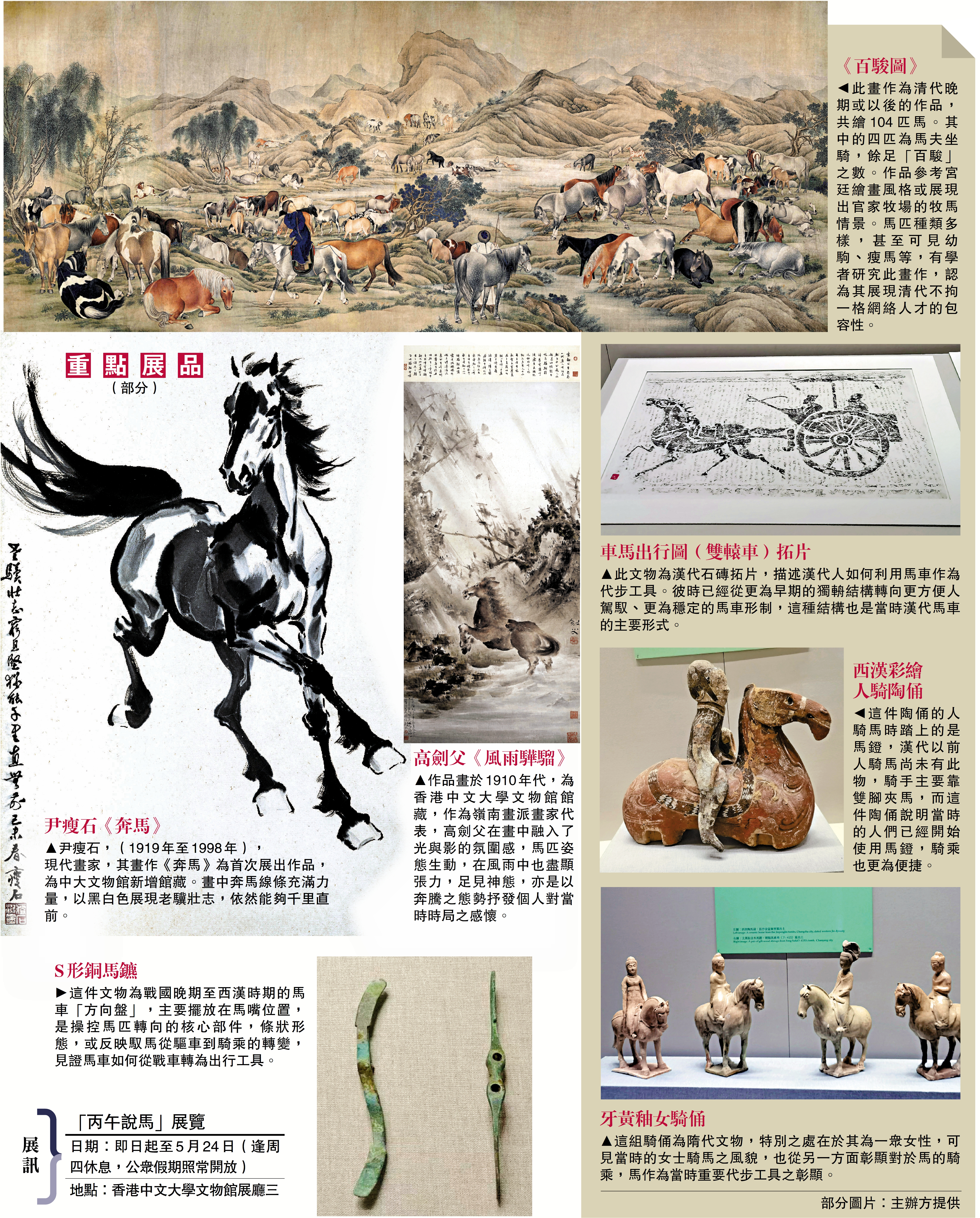 再過10天,就是丙午馬年。為了應節,也為了讓更多觀眾了解馬在中國文化中的發展歷程,香港中文大學文物館即日起至5月24日舉行年度生肖展覽「丙午說馬」,共展出40餘組與馬有關的文物,展現馬在歷史上的不同時期的演變和風貌、豐富的文化內涵,以及如何改變人的生活。\大公報記者 劉 毅(文、圖)