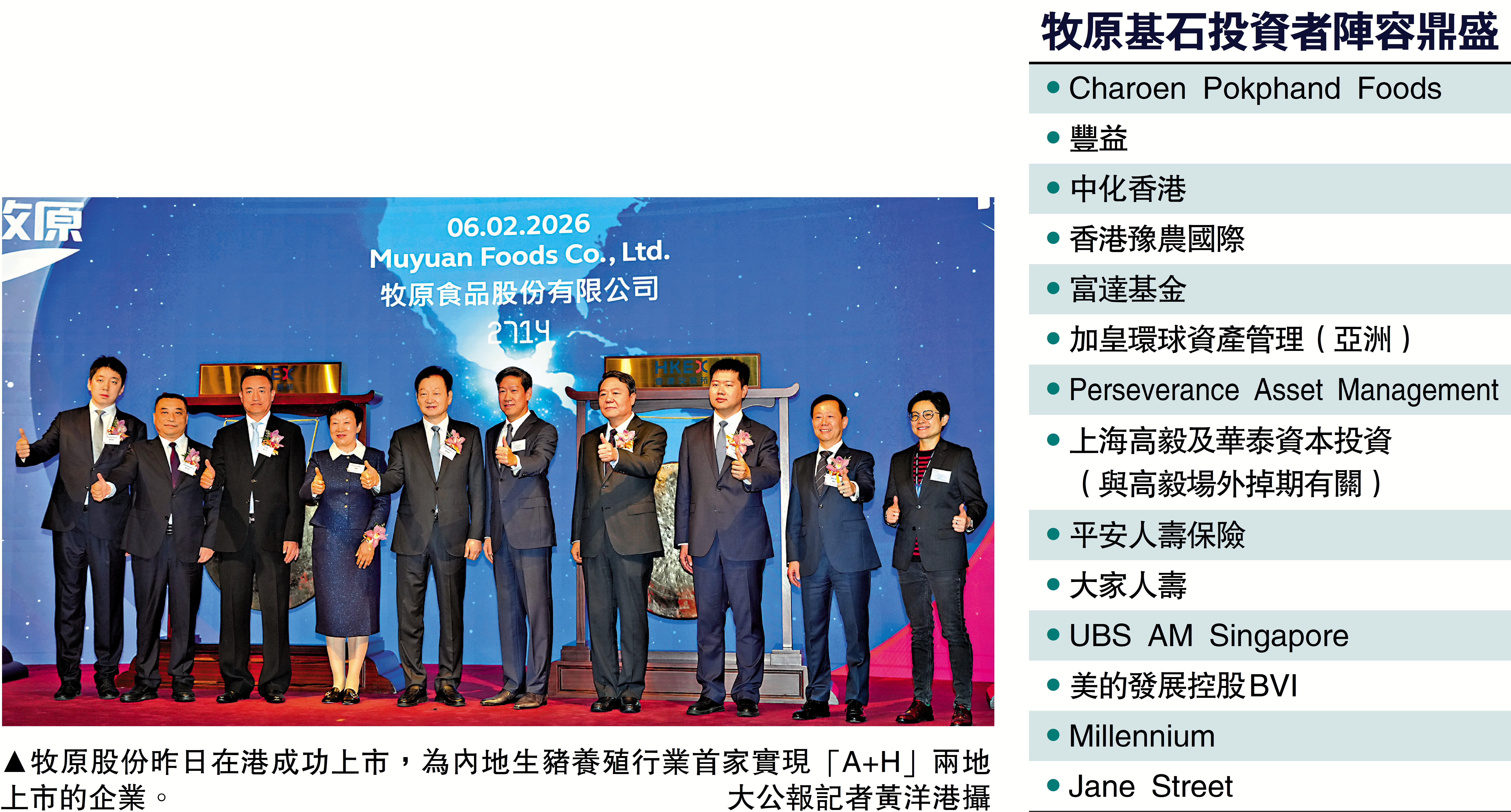 牧原股份是次IPO集資106.8億元,若計及超額配股權,集資規模最高可達120.38億元,為2026年全球最大規模的農牧企業新股發行,亦是近年港股農業板塊最大宗IPO。該股首日掛牌獲資金追捧,成交16.3億元,收市報40.52元,較招股價39元上升3.9%,每手100股,一手賬面賺152元。