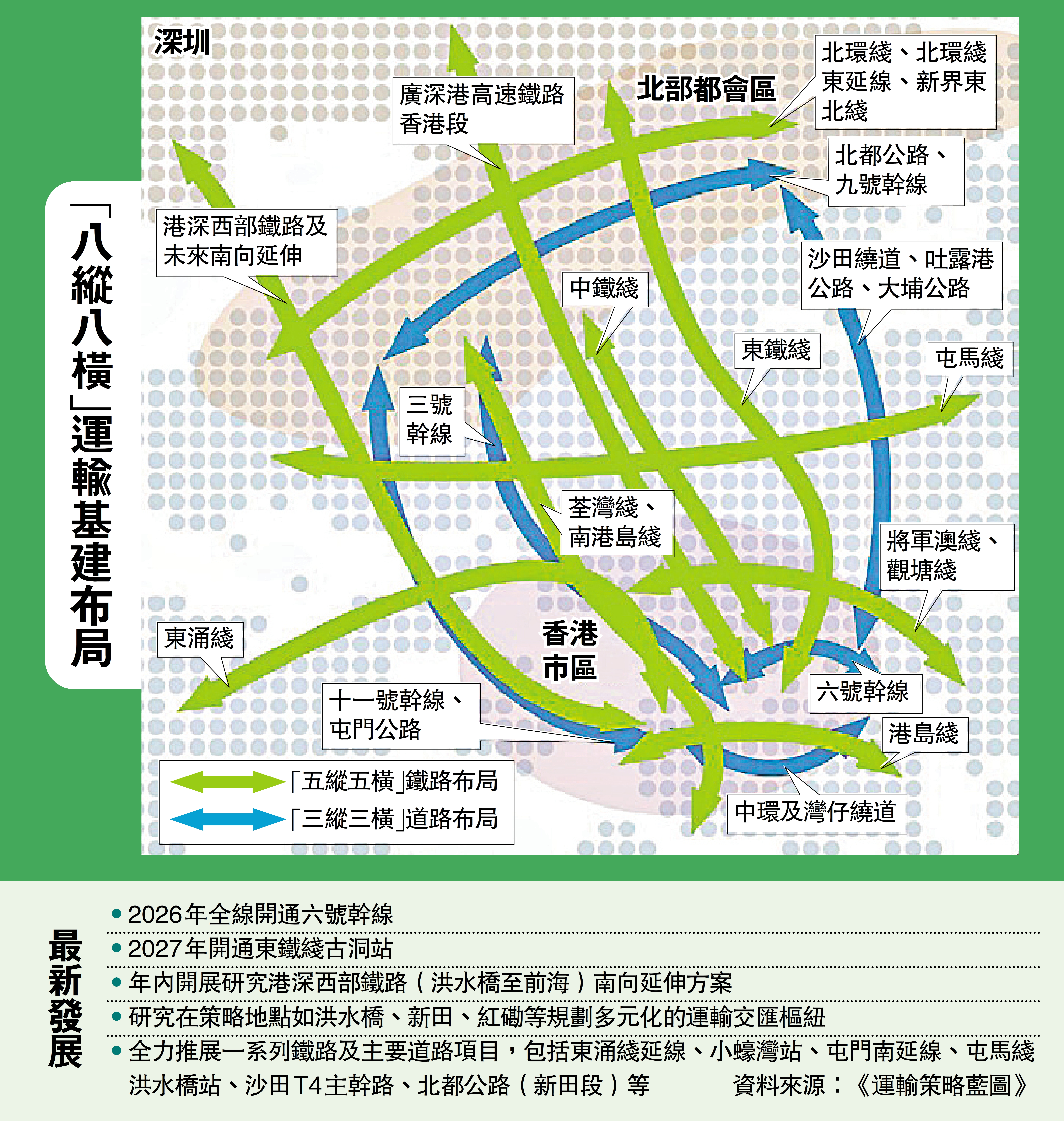 《藍圖》提出以運輸基建驅動發展,建議擴展運輸基建,建設內外連通網絡,包括在「八縱八橫」的運輸基建布局下(見圖表),在今年內全線開通六號幹線,並全力推展一系列鐵路及主要道路項目,包括東涌綫延綫、小蠔灣站、屯門南延綫、屯馬綫洪水橋站、沙田T4主幹路、北都公路(新田段)等。政府亦會開展研究港深西部鐵路(洪水橋至前海)南向延伸方案,並在策略地點如洪水橋、新田、紅磡等規劃多元化的運輸交匯樞紐,連通港九新界、市區及北部都會區各個經濟和居住區域,帶動經濟發展、促進人員往來及加快貨物暢通流動。