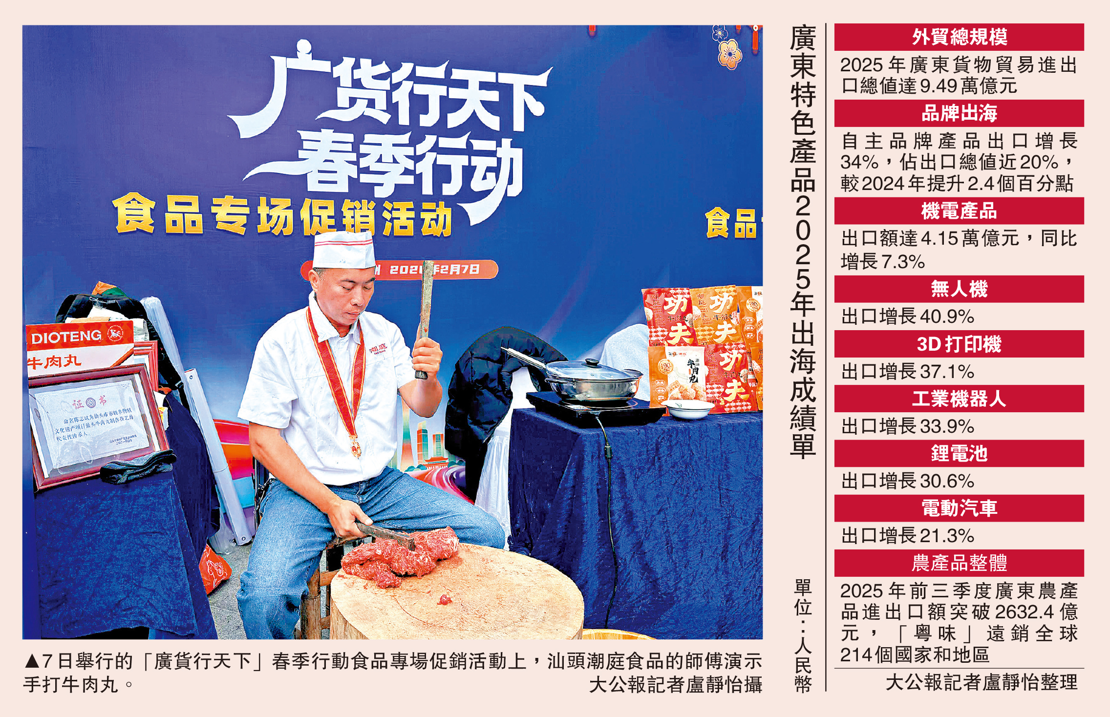 港人最愛的潮汕牛肉丸,出口美國市場的皮蛋……拓寬全球渠道,將「廣貨」賣向全世界,是此次「組團」亮相的廣東食品企業共同的心願。廣東省工信廳當天公布數據顯示,廣東去年規上食品營業收入將近9000億元(人民幣,下同),省內已形成飼料、糧油加工、飲料三大千億級食品子集群,食品產業鏈出海優勢明顯。\大公報記者 盧靜怡廣州報道
