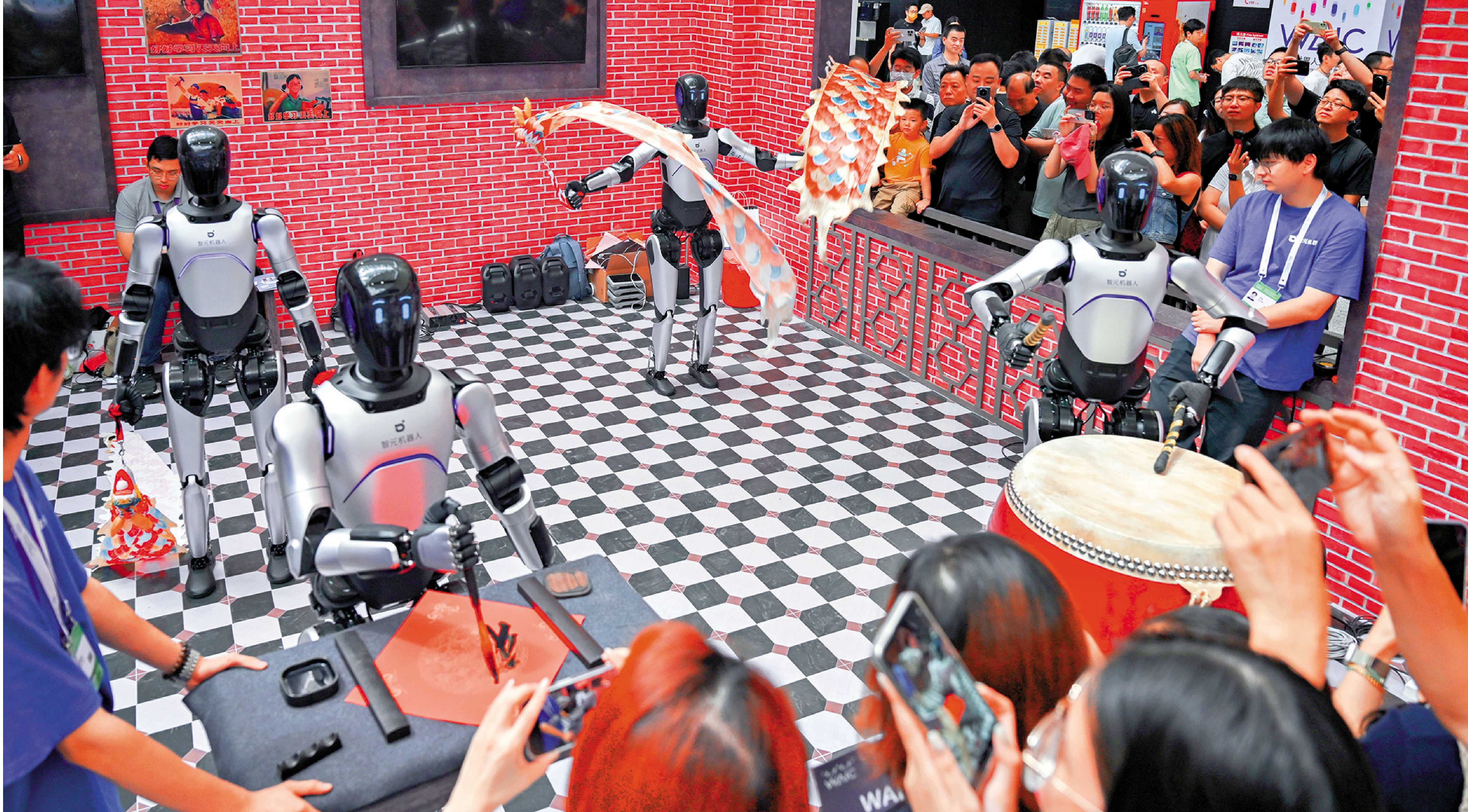 2025年12月至2026年1月,短短一個月內,5家上海AI企業上演了一場現象級的「上市接力賽」:沐曦股份、英矽智能、壁仞科技、天數智芯、稀宇科技(MiniMax)密集登陸科創板和港交所。而被譽為「上海GPU四小龍」的另一成員燧原科技,科創板IPO已獲得受理。這波現象級爆發的背後藏着「最有耐心的合夥人」─上海國資。在具身智能賽道領域,上海國投為鏈主企業「智元機器人」探索提供跨境金融、場景應用等投資賦能,助力這家獨角獸企業在上海的高質量發展。圖為去年7月上海2025世界人工智能大會上,智元機器人的「才藝」展示吸引參觀者駐足觀看。\新華社