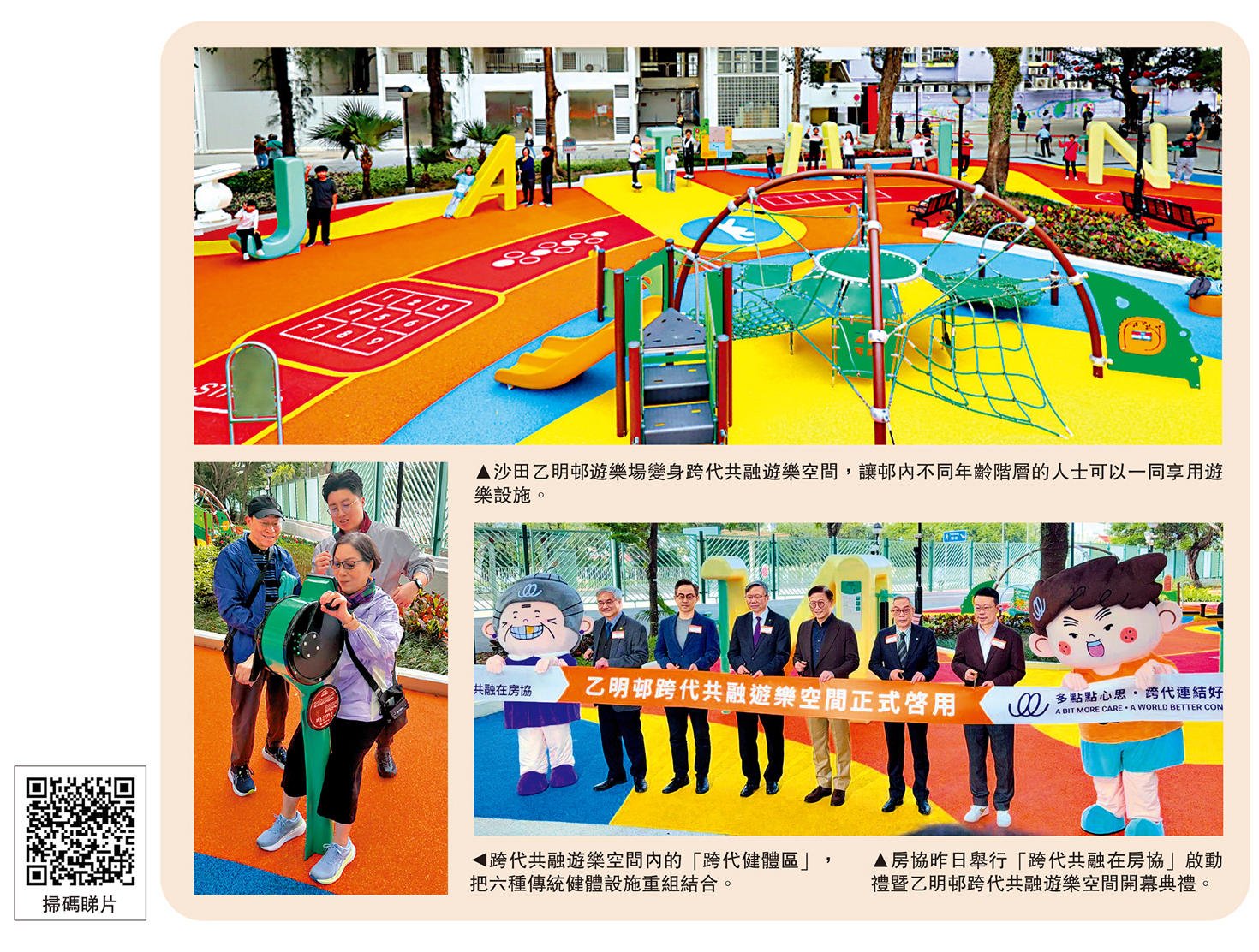 房協主席凌嘉勤表示,乙明邨作為房協試點屋邨,會繼續善用「房屋實驗室」的角色,建立跨代共融的居住環境和社區,呼應不同代際居民需求,樂見和希望跨代共融遊樂空間能夠為社區帶來新活力、新氣象,未來會在旗下不同業務範疇貫穿相關理念。