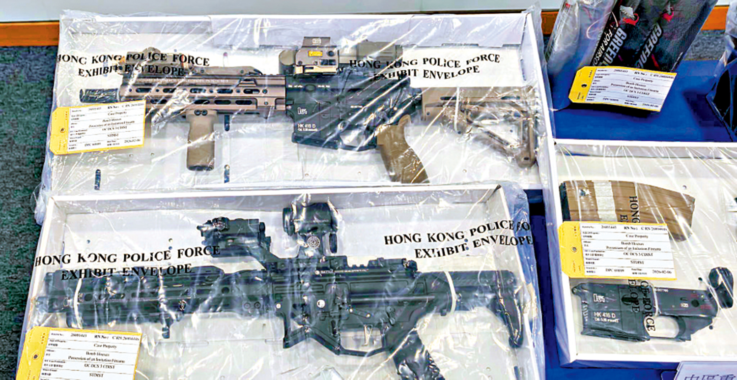 警方表示,上月27日接獲市民在網上舉報,指在玩手機線上遊戲時,有人在遊戲群組中聲稱在農曆年初一,會在港鐵金鐘站放置炸彈。警方隨即部署大量軍裝人員,包括軍裝巡邏小隊、衝鋒隊、反恐特勤隊等,到相關港鐵站及附近一帶進行大規模搜索,最後並沒發現任何可疑物品。中區重案組進行大量情報分析及調查後,鎖定疑犯身份,前日在沙田拘捕1名31歲本地男子,在其住所檢獲2支仿製步槍及1支仿製手槍,以及仿製槍械零部件,包括彈匣、槍管和塑膠子彈等。同時,檢獲戰術頭盔、背心和腰帶,暫時無發現其他危險品。警方稍後會將檢獲槍械進行鑑證,以確認是否符合法例。