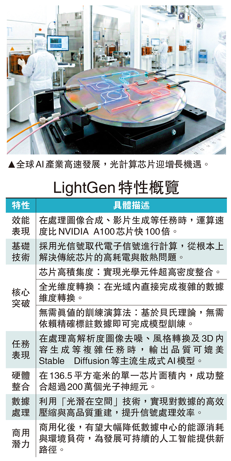 名為「LightGen」的技術之所以能實現性能躍升,關鍵在於單一芯片上同步突破三項核心瓶頸:首先,達成「單芯片上百萬級光學神經元集成」;其次,實現「全光維度轉換」;第三,開發出「不依賴預設真值的光學生成模型訓練算法」。這些突破使得面向大規模生成式任務的「端到端全光計算」成為可能。