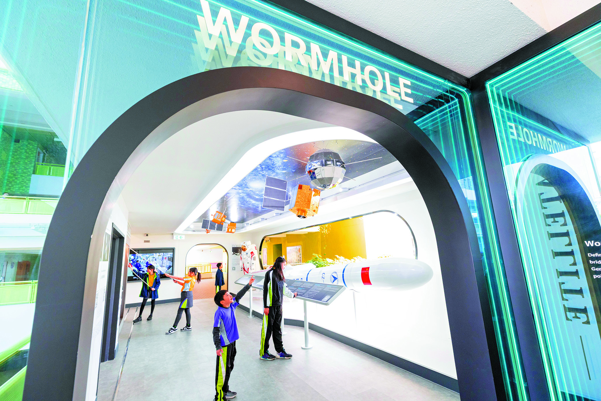 步入校園,迎面而立有三支六米高的中國火箭模型;沿樓梯到禮堂外中庭,可仰望直徑5米的北斗衛星系統模型。穿過連接中庭與課室,名為「蟲洞」的長廊,有五枚標誌性的中國人造衛星點綴銀河天花板、一支六米長火箭橫卧展示內部結構,搭配牆上簡介和播放航天視頻的熒光幕,學生們可在此太空漫步,更或透過互動展品體驗不同星球的重力。誰能想到穿越校園走廊亦能成為沉浸式學習體驗呢!