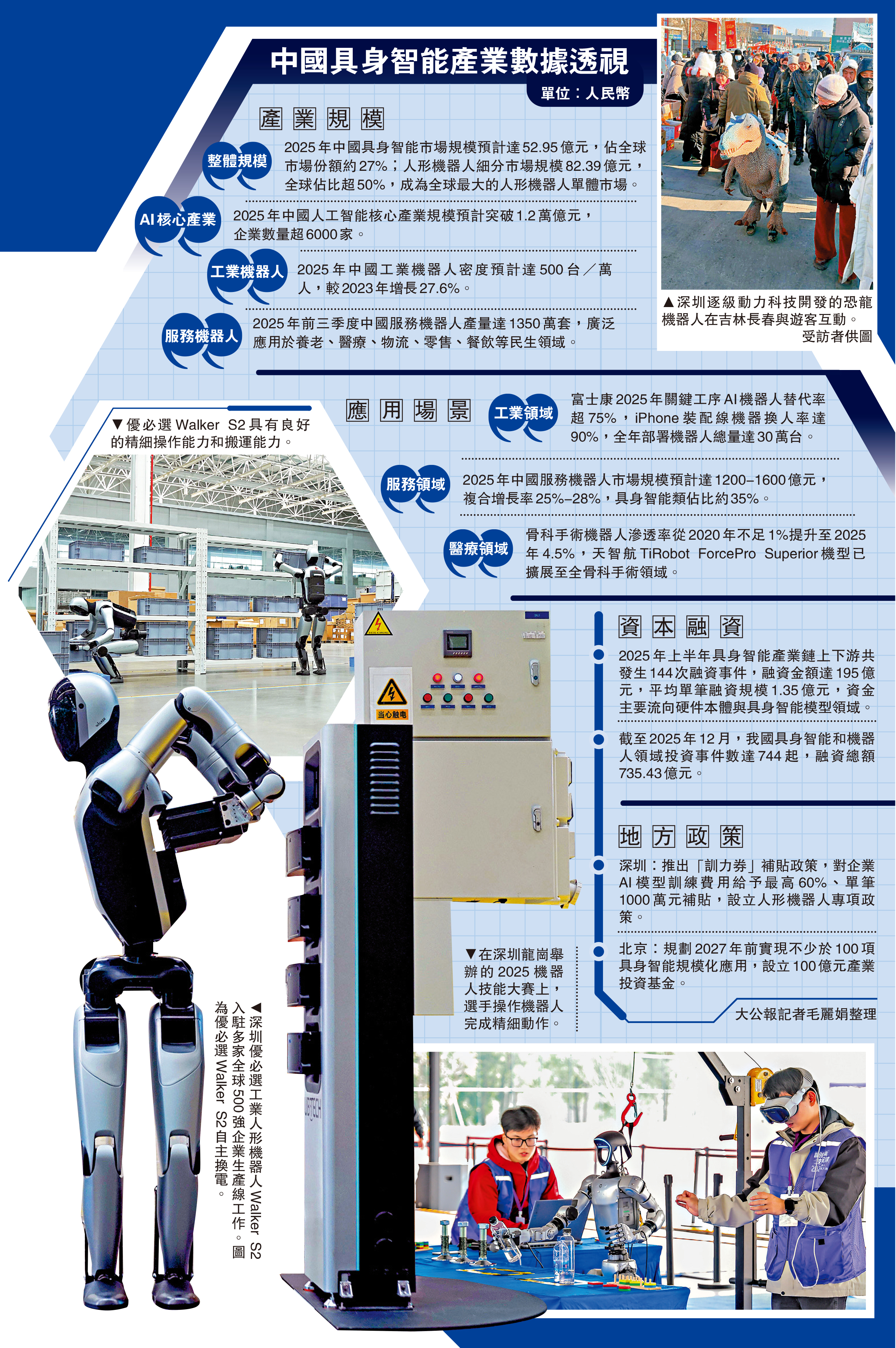 智元機器人「遠征A2」完成全球首次人形機器人跨省行走,眾擎機器人登上競技賽場接受格鬥賽檢驗……「聰明能幹」的深圳機器人更吸引全球500強企業青睞,日前,美國德州儀器、歐洲航空巨頭空巴相繼引進深圳優必選工業人形機器人Walker S2應用於生產線,將國產具身智能機器人推向半導體製造、航空製造等全球工業生產場景,進一步彰顯其作為新質生產力的應用價值。\大公報記者 毛麗娟