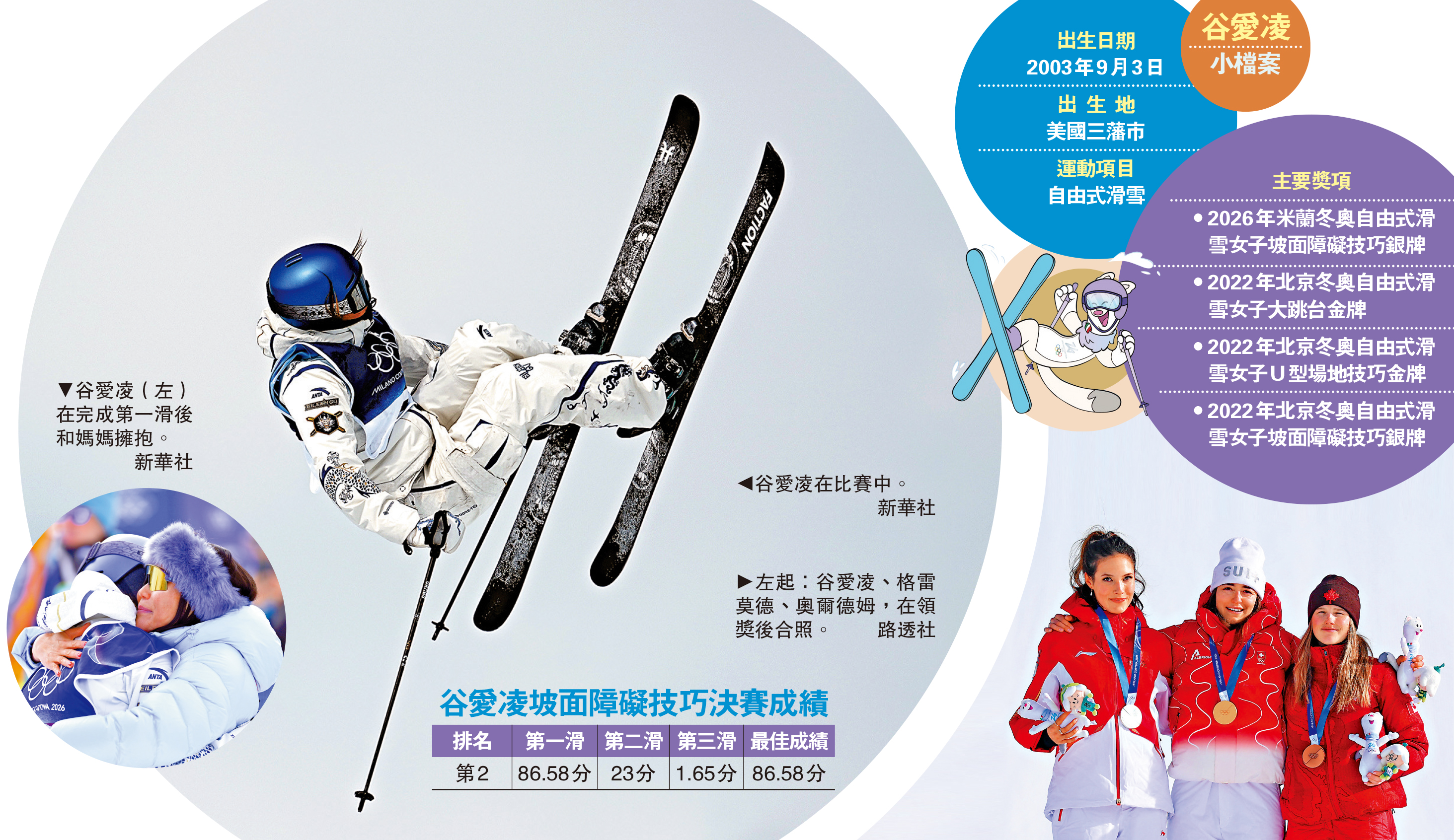 米蘭冬奧會9日晚在利維尼奧雪上公園舉行自由式滑雪女子坡面障礙技巧項目決賽,上屆北京冬奧銀牌得主、中國名將谷愛凌向金牌發起衝擊。谷愛凌在首輪取得86.58分一度在所有運動員中領先,但爭取衛冕冠軍的瑞士選手格雷莫德於第2滑以86.96分後來居上,隨着谷愛凌在最後一滑出現失誤,最終她複製上屆成績,收穫本屆冬奧中國體育代表團首枚銀牌的同時,個人冬奧生涯亦增至2金2銀。\大公報記者 梁潤森