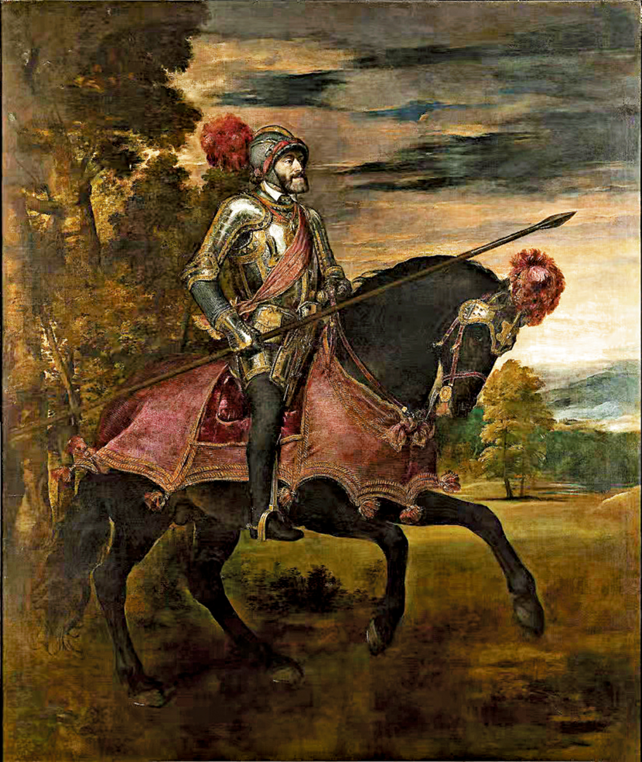 提香所繪《查理五世騎馬像》不僅開創了歐洲君主騎馬肖像的傳統範式,更在未來數個世紀中成為了騎馬帝王肖像的不二模版。生於現比利時根特市的查理五世在身為神聖羅馬帝國皇帝統治期間,其領土不僅包括現西班牙、奧地利等國,還囊括整個尼德蘭地區。畫作是查理五世的妹妹為紀念兄長於一五四七年四月二十四日在米爾貝格擊敗德意志新教聯盟後邀請已近花甲之年的提香所作。在夕陽西下般的自然風光背景襯托下,一襲戎裝的查理五世手持長矛騎着高頭俊馬穩步前行。此時已步入晚年的提香在色調運用上比年輕時更加濃郁厚重,卻仍未摒棄他那標誌性的「提香紅」(胭脂蟲紅湖Carmine Lake)── 被用在查理五世及馬匹頭盔上的紅纓、身披的綬帶和馬鞍上,象徵着十六世紀戰爭中的天主教信仰。他身披的鎧甲肩部和胸口的兩處高光巧妙地提亮了他的臉頰,折射出畫家早期精緻的寫實主義細節;而背景的森林以及對遠景天空的渲染,則展示出他藝術生涯中期對於營造畫面氛圍的重視。和馬背幾乎平行的長矛在這裏具有多重含義,除了暗示此兵器是天主教騎士聖喬治屠龍時所用,更象徵着神聖羅馬帝國皇帝至高無上的皇權。