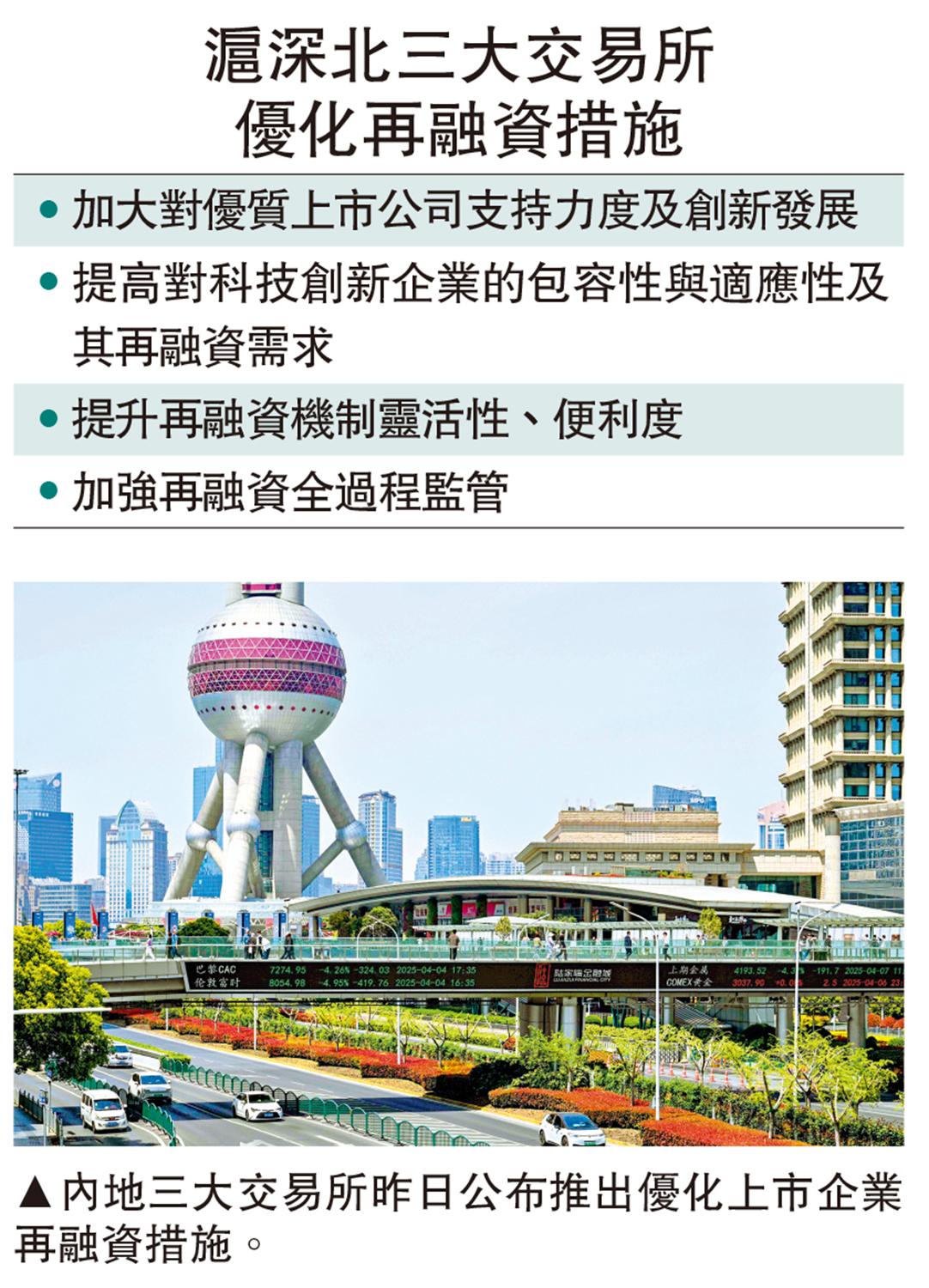 【大公報訊】上海、深圳及北京三大交易所昨日公布推出優化再融資一攬子措施。包括加大對優質上市公司支持力度及創新發展;提高對科技創新企業的包容性與適應性及其再融資需求;提升再融資機制靈活性、便利度;加強再融資全過程監管等(見附表)。新華社的文章指出,本次優化舉措釋放扶優、扶科的政策導向突出、系統優化再融資流程回應市場關切、加強再融資全過程監管營造良好市場生態三個信號。業內人士預計,舉措有利上市公司搶抓市場機遇,進一步做優做強,引導市場資源加快向新質生產力領域聚集。證監會有關部門負責人透露,未來再融資政策還將持續升級,持續提高包容性和適應性。