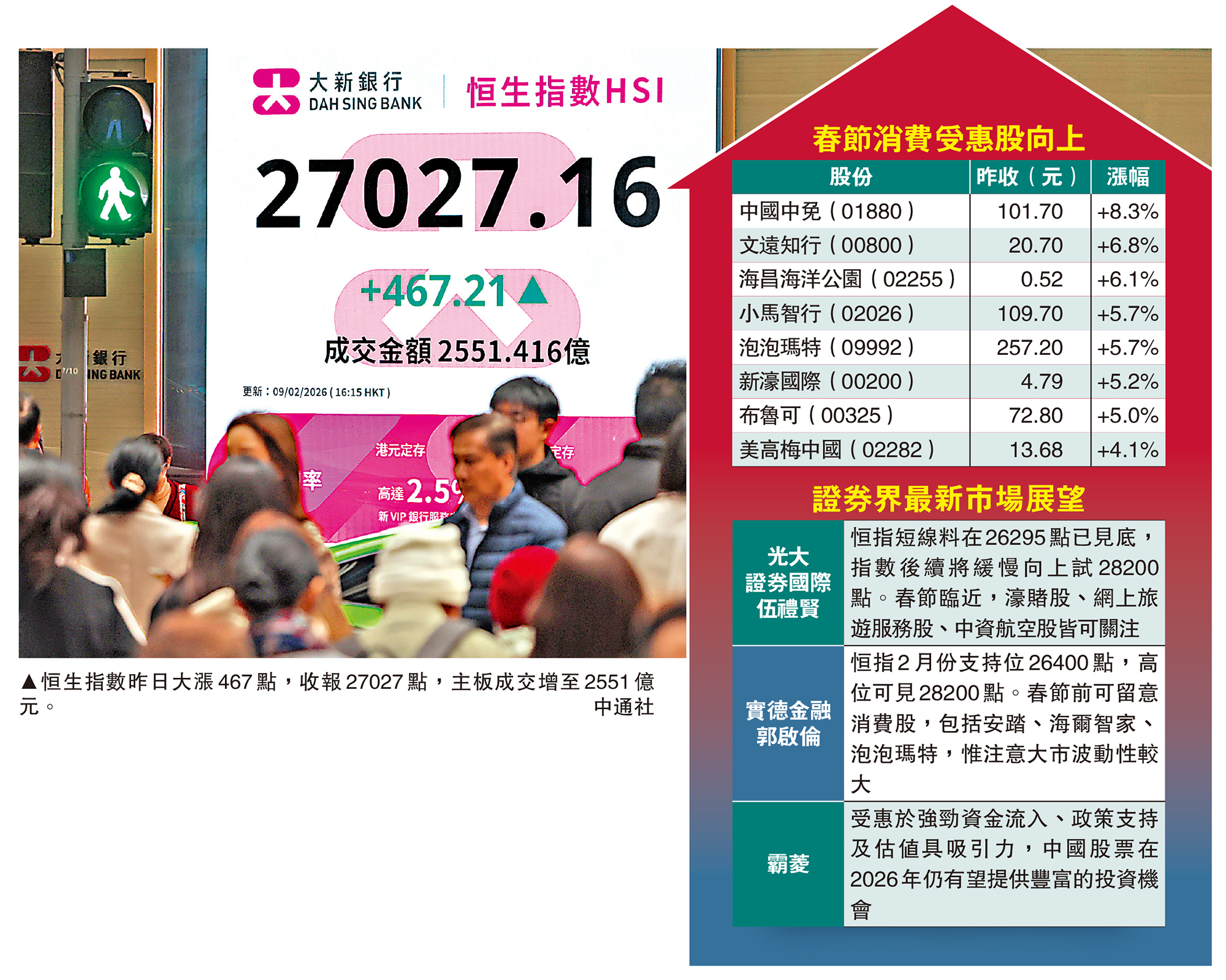經歷上周大幅震盪後,環球風險資產稍見喘穩。亞太區股市昨日上揚,恒指全日收市反彈467點,重上二萬七關。臨近春節消費旺季,消費股延續上周造好勢頭,泡泡瑪特(09992)股價再升5.7%,連升第六日。中國中免(01880)股價升8%,再次晉身紅底股行列。證券界人士認為,濠賭股、網上旅遊平台股、中資航空股皆屬春節消費旺季受惠股。