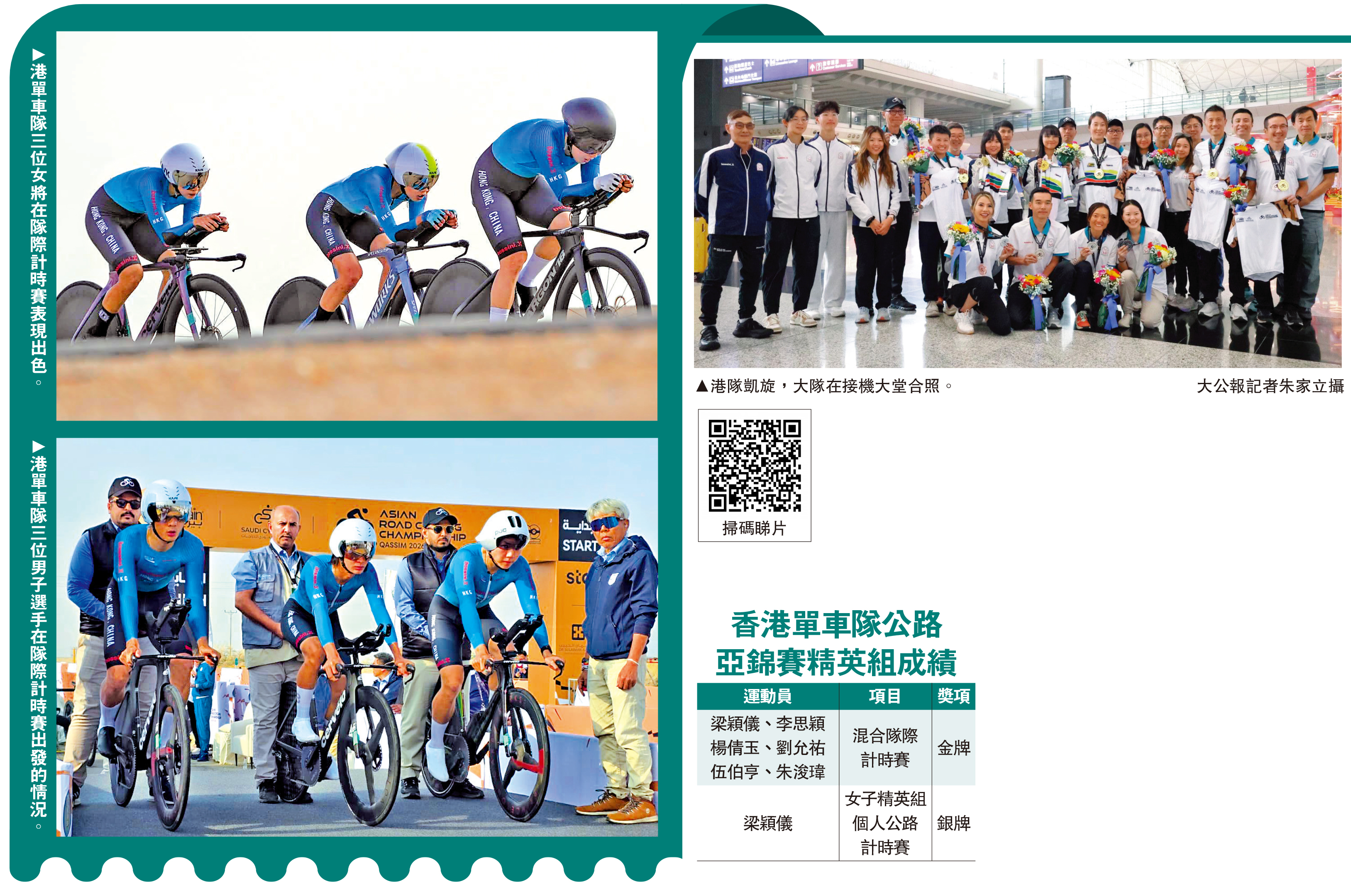 中國香港單車隊上周六在沙特阿拉伯舉行的2026亞洲公路單車錦標賽中,首次奪得男女子混合隊際計時賽金牌,以及由梁穎儀在女子精英組計時賽取得銀牌,兩枚獎牌皆為港隊史上最佳成績,至於聶偉文率領的元老隊亦在賽事中奪得5金9銀4銅,亦是歷屆之最。大軍10日凱旋,分享奪金喜悅。李思穎坦言自己在個人賽發揮未如理想,但團體賽奪金為港隊備戰亞運注入不少信心。梁穎儀則直言個人賽奪銀給予自己不少信心,希望在名古屋亞運會站上領獎台。\大公報記者 朱家立