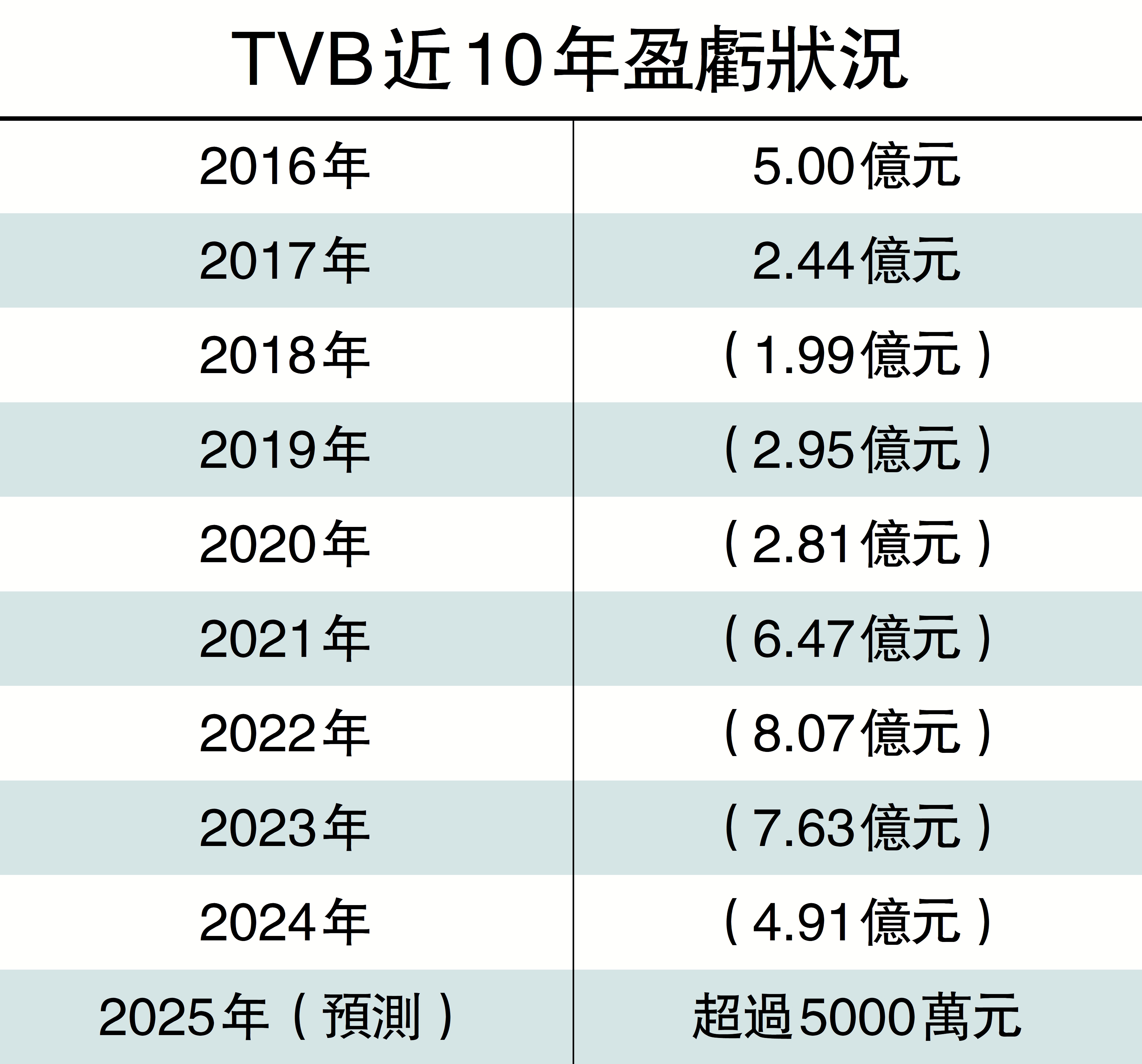 【大公報訊】電視廣播(00511、TVB)有望扭轉連續7年虧損的困局,預計2025年EBITDA將錄得超過3.5億元,即按年升18.6%,全年業績將扭虧為盈,股東應佔溢利逾5000萬元,預計全年實現每股收益至少為0.11元。