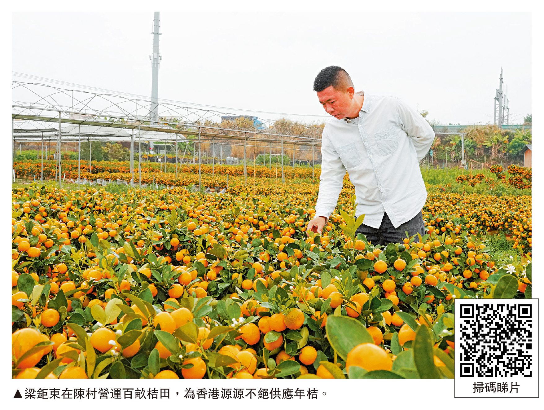 梁鉅東說,現時與合作社一起營運約100畝桔田,年產量約10萬盆小盆栽年桔,2萬盆大盆栽年桔,當中兩成會供往香港市場,香港市場更喜歡小盆栽,近年來7吋的金桔盆景最為暢銷……沒與記者聊幾句,便又有顧客光臨。