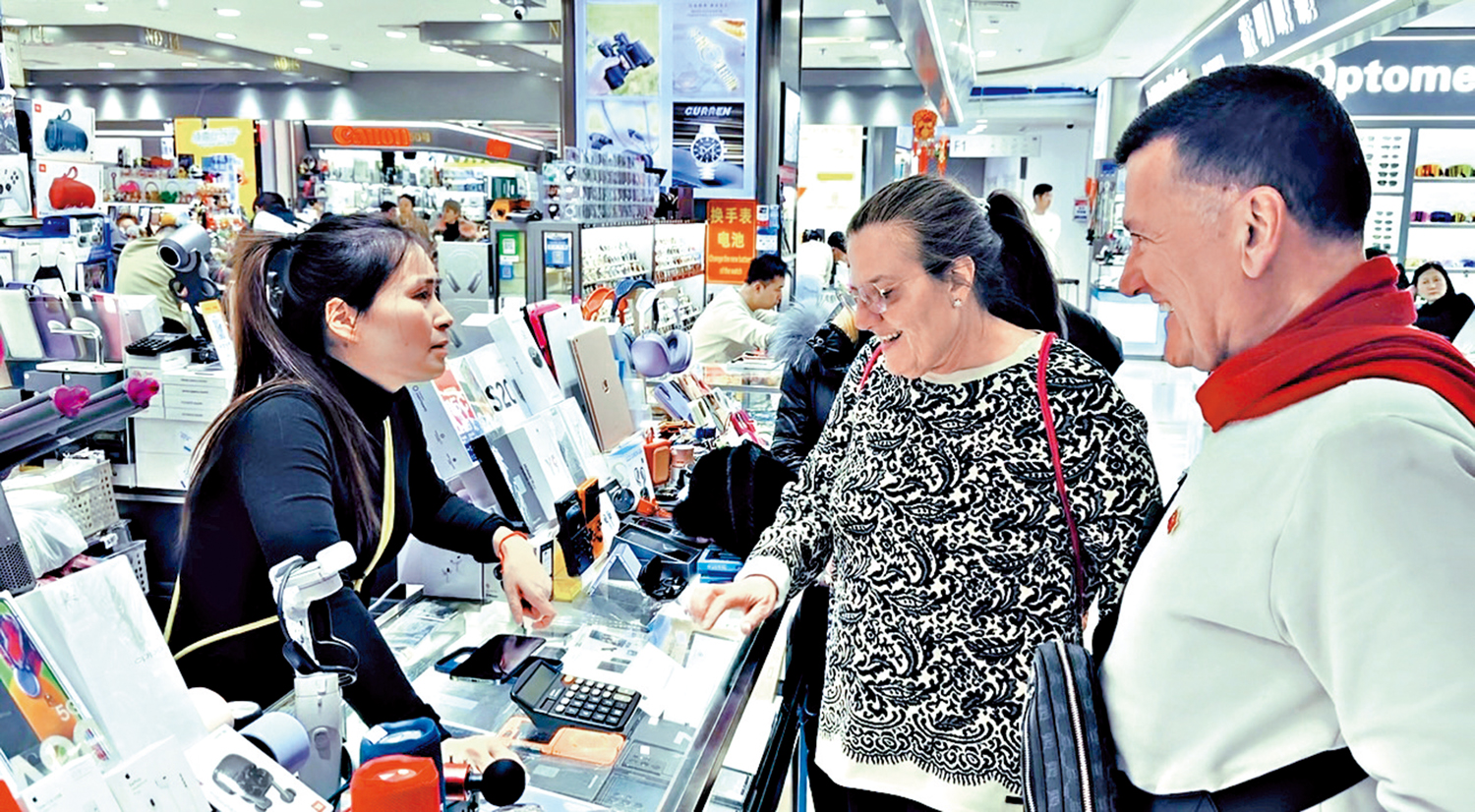 來自西班牙的Mary夫婦忙着砍價,他們在計算器上輸入價格,配合手勢與表情與商家「交談」,最終買下一部翻譯機:「太實用了!我還在這裏買了五件定製的絲綢連衣裙,全靠它跟店家溝通。」Mary隨即通過翻譯機真摯地「說」:「我想對中國人說─我愛你們,你們是很棒的人。」在紅橋市場,不少外國遊客甚至推着空行李箱來「掃貨」。一位德國遊客坦言:「這裏性價比太高了,我準備把一些暢銷款推薦給家鄉的朋友。」\大公報記者李暢