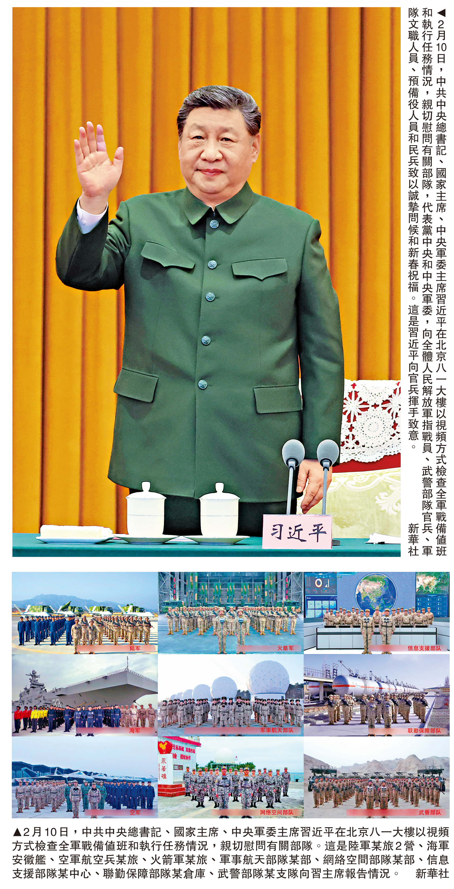 新春佳節即將來臨之際,中共中央總書記、國家主席、中央軍委主席習近平10日在北京八一大樓以視頻方式檢查全軍戰備值班和執行任務情況,親切慰問有關部隊,代表黨中央和中央軍委,向全體人民解放軍指戰員、武警部隊官兵、軍隊文職人員、預備役人員和民兵致以誠摯問候和新春祝福。
