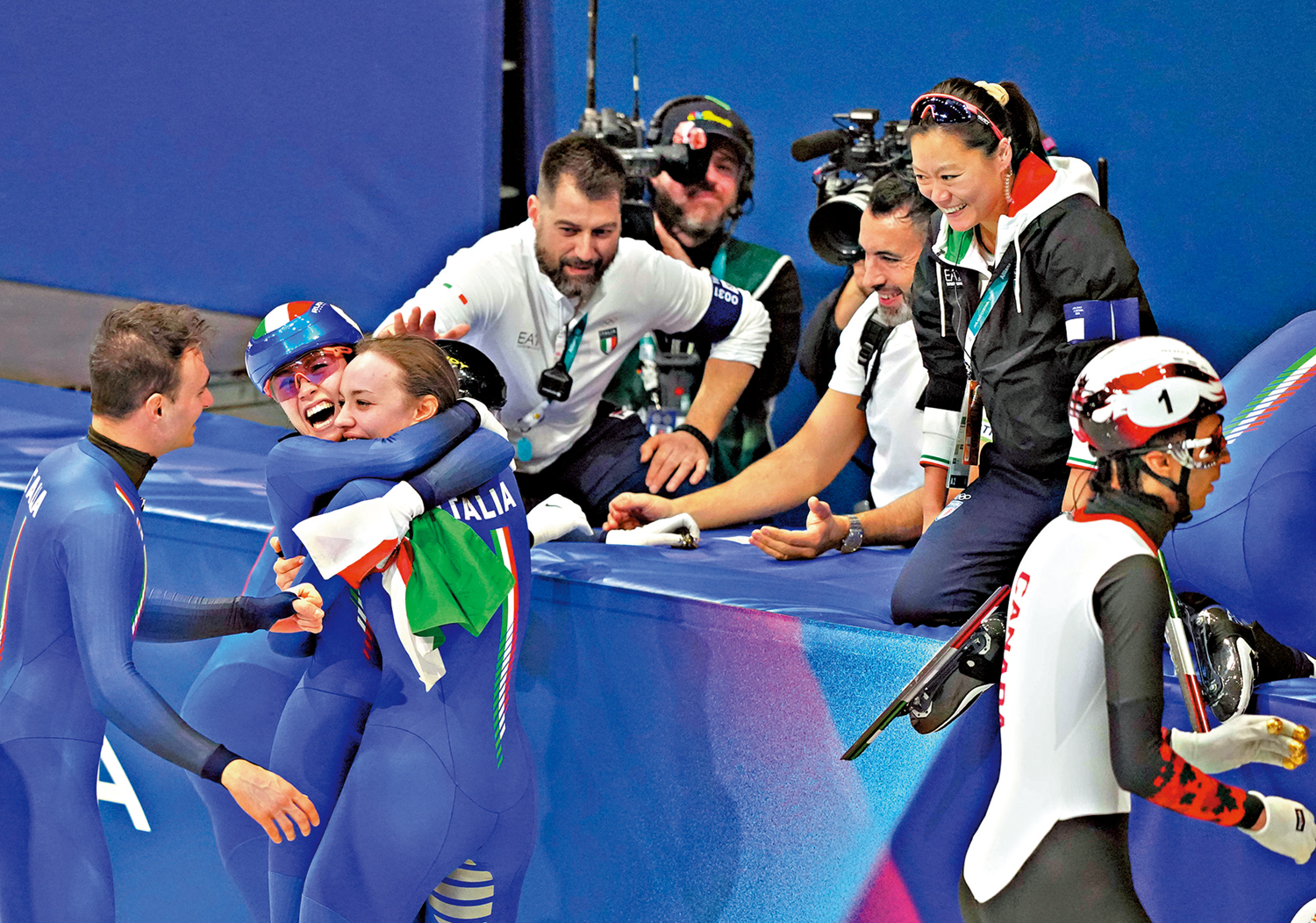 當東道主意大利隊在10日的米蘭冬奧會短道速滑賽場奪得2000米混合團體接力冠軍時,現場沸騰了。冰場邊慶祝的人群中,有一張中國面孔格外醒目︱她眼含熱淚,高喊着「Italia,brava!(意大利,太棒了!)」,在冰面旁挨個擁抱隊員。她是38歲的齊夢瑤,意大利隊的中國主教練。米蘭冬奧是她第一次以主教練身份帶隊出征冬奧。