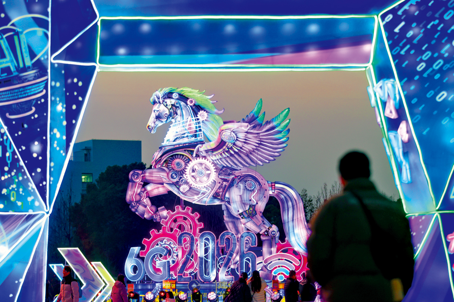 二月十日晚,「6G之城·科技中國年」首屆上秦淮燈會點亮江蘇南京,科技感滿滿的飛馬彩燈點亮。燈會布設賽博飛馬、科技之門等數十組燈組,融合魚燈巡遊、機器人展演、機器人寫「福」字等科技互動項目,將傳統年味與前沿科技交融,打造具有新意的「科技+文化」新春體驗。\中新社