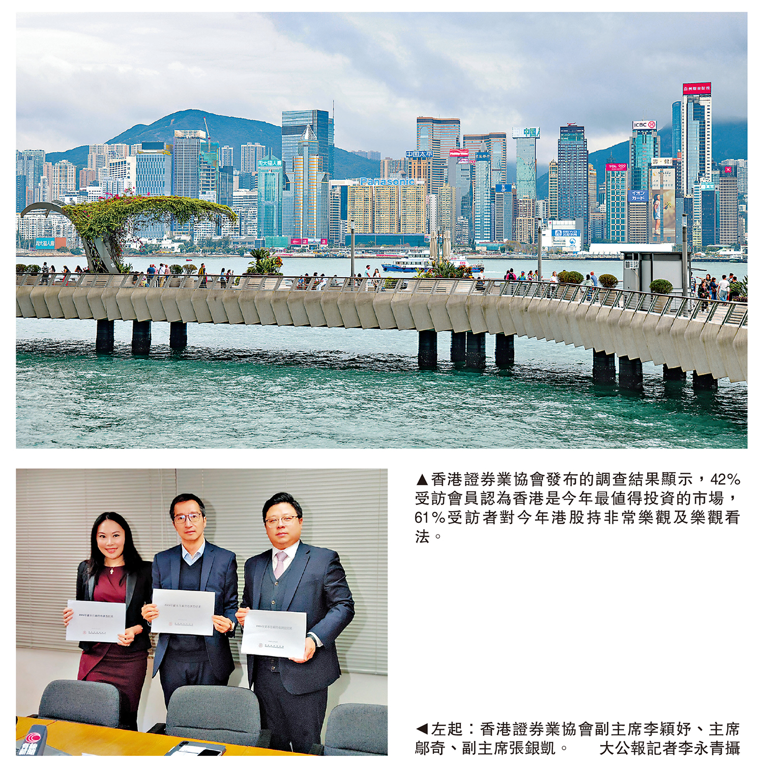 香港證券業協會昨發表2026年資本市場問卷調查,結果顯示,42%受訪會員認為香港是今年最值得投資的市場,中國內地以28%居第二;59%認為美國是今年投資風險最高的市場,13%認為是歐洲。同時,80%受訪者看升今年港股,其中61%持樂觀及非常樂觀看法。至於今年哪個板塊將跑贏大市,38%認為金融服務行業,兩成認為是科技及人工智能(AI)。\大公報記者 李信