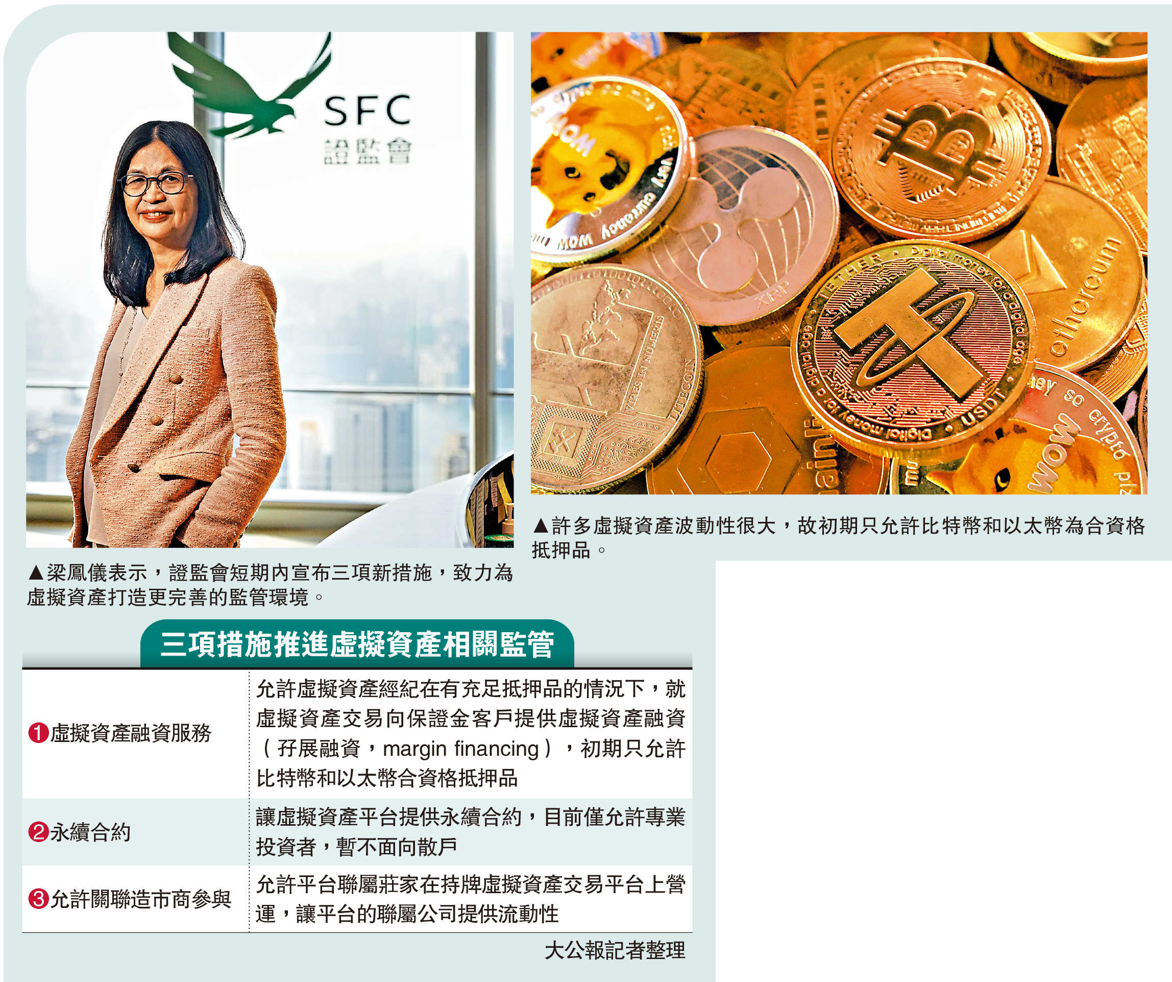 香港積極完善整個數字資產生態圈。證監會行政總裁梁鳳儀昨日在Consensus香港大會2026指出,證監會致力為虛擬資產打造更完善的監管環境,於短期內推出三項新措施,包括首先是允許經紀商向信用良好的客戶提供融資,抵押品可以是證券或虛擬資產;其次讓平台向專業投資者提供永續合約(perpetual contracts);再者為允許關聯造市商(俗稱莊家)在持牌虛擬資產交易平台上營運,讓平台的聯屬公司提供流動性。\大公報記者 麥晉瑋