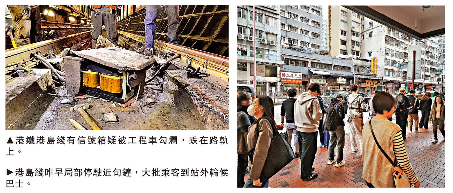 昨早約6時40分,港鐵公布由於有物件阻礙路軌,港島綫灣仔站附近列車服務暫停;灣仔站一度封閉,上環站至鰂魚涌站的列車服務需要暫停,港鐵安排穿梭巴士接載受影響乘客。至上午7時30分,阻礙路軌的物件被移除,列車服務逐步回復正常。事故發生時正值早上高峰,返工上學的人潮陸續湧現,大批市民出行受到影響,巴士站大排長龍,非常擁擠。