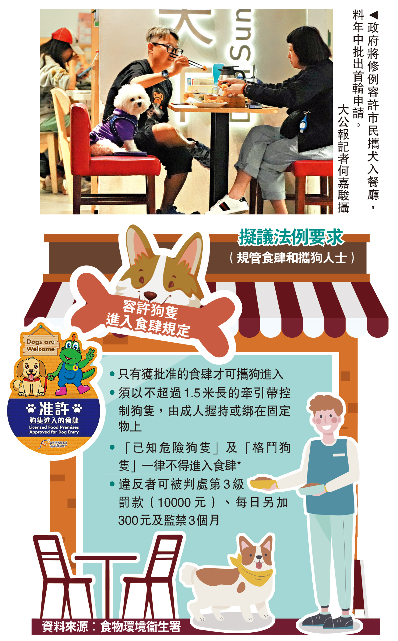 【大公報訊】記者鄭文迪報道:政府將修例容許市民帶同狗隻進入餐廳,預計今年中批出首輪申請,首階段擬設500至1000個名額。環境及生態局局長謝展寰昨日表示,聽到不同聲音後會審視每名顧客帶入餐廳的狗隻數量,以及會否就餐廳的面積設上限等,每名狗主或最多攜2隻狗入餐廳,具體數量需與專家商議。