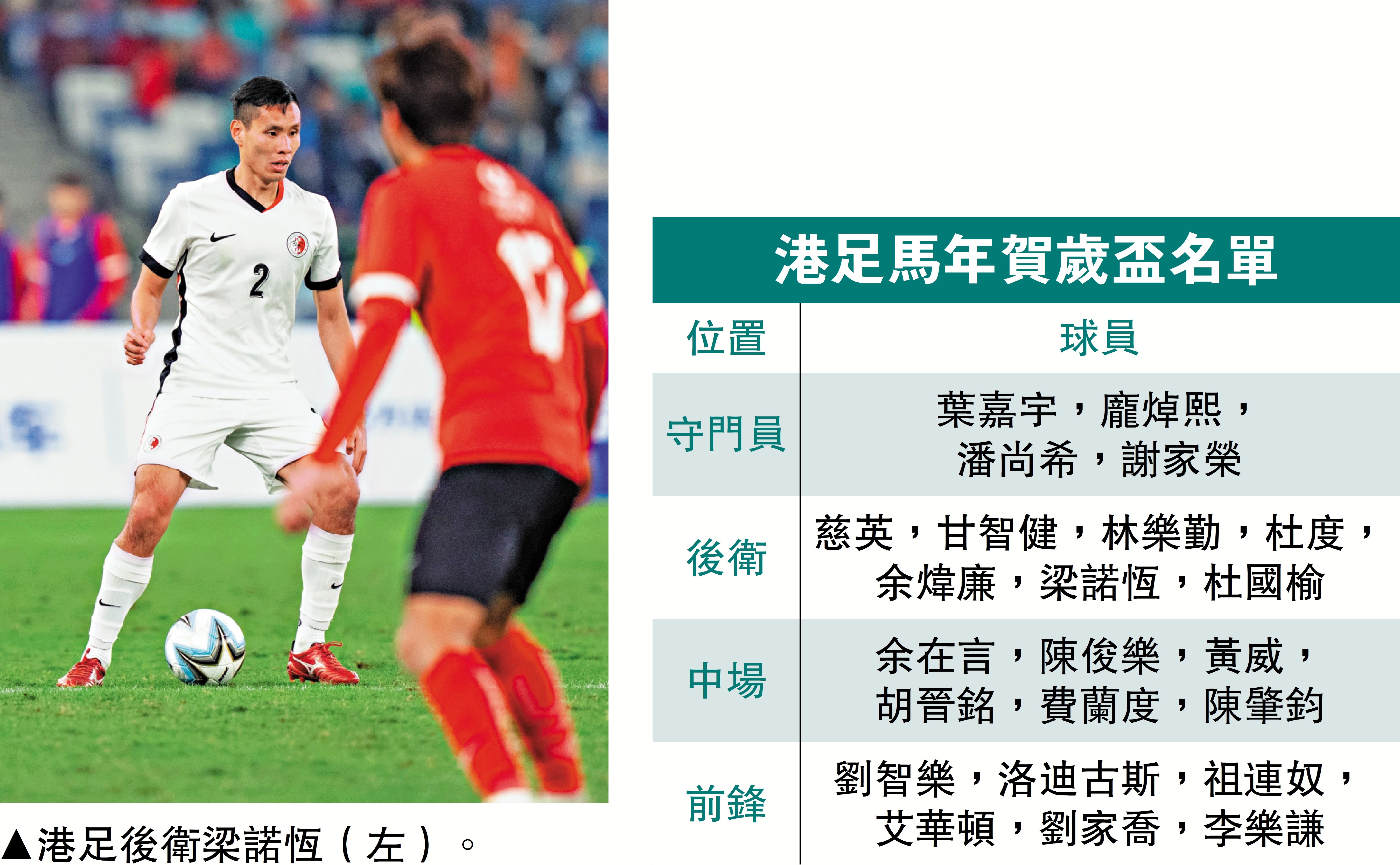 【大公報訊】記者張銳報道:中國香港足球隊將於21日大年初五下午3時在香港大球場出戰FWD富衛保險賀歲盃2026,迎戰韓職聯勁旅FC首爾。中國香港足球總會12日公布23人決選名單,多名常規主力續獲徵召,同時亦見新面孔及年輕球員入圍,當中包括兩位首度躋身「大港腳」決選的門將葉嘉宇與潘尚希,外流球員則僅得中甲深圳青年人後衛梁諾恆一人。