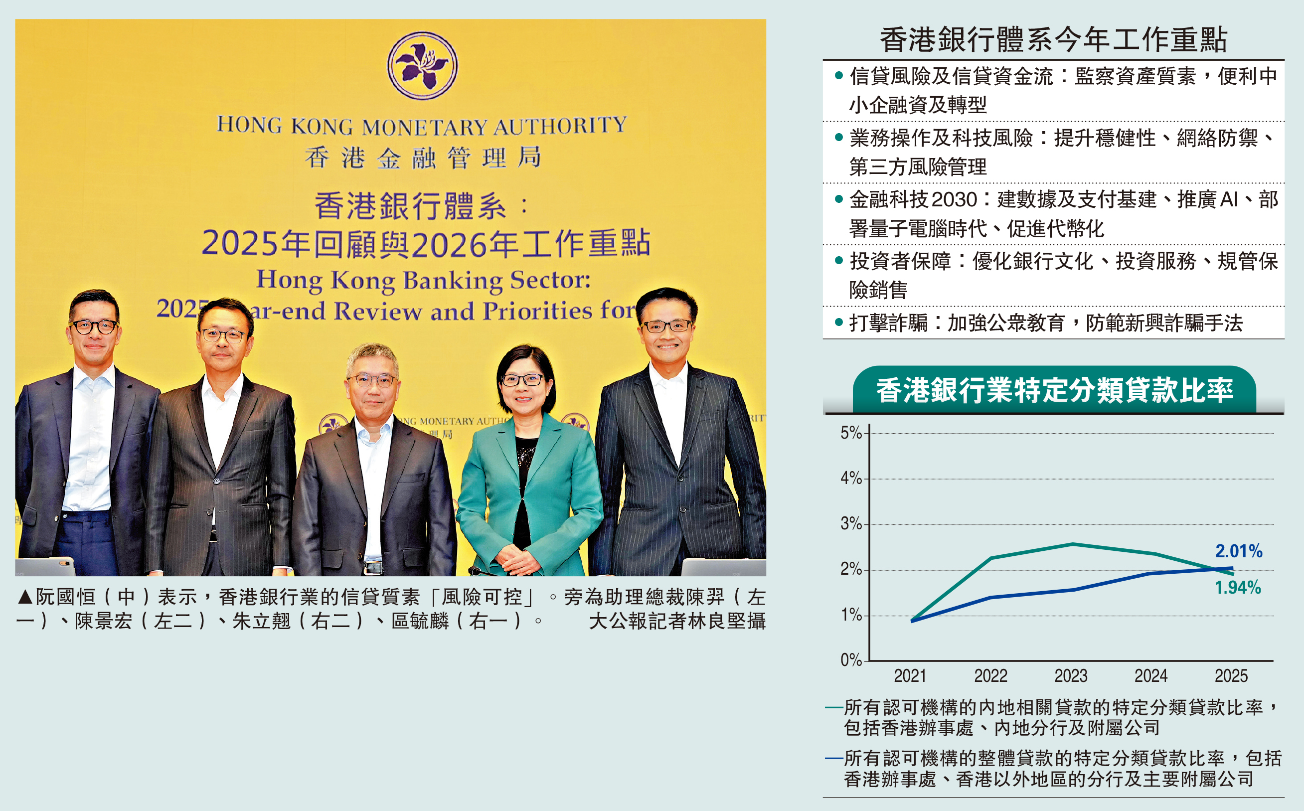 金管局昨公布本港銀行業最新的不良貸款率。截至2025年底,整體銀行體系的特定分類貸款比率(相當於不良貸款率)進一步攀升至2.01%,按季溫和上升0.03個百分點。金管局副總裁阮國恒表示,信貸風險仍是今年首要工作重點,強調銀行業的撥備覆蓋率足夠,而銀行業維持較好的盈利能力,相信整體信貸質素可控。\大公報記者 黃裕慶
