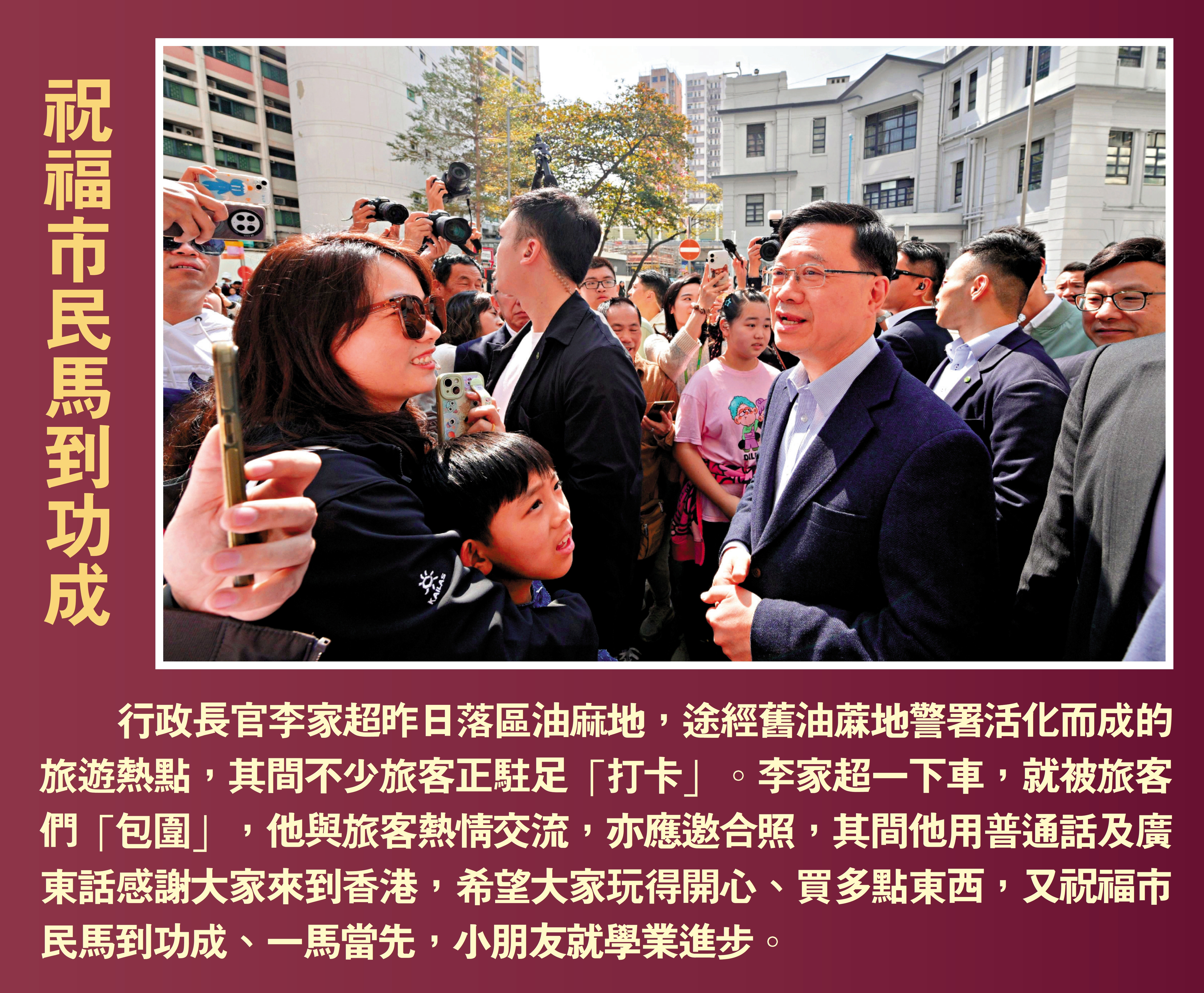 行政長官李家超昨日落區油麻地,途經舊油蔴地警署活化而成的旅遊熱點,其間不少旅客正駐足「打卡」。李家超一下車,就被旅客們「包圍」,他與旅客熱情交流,亦應邀合照,其間他用普通話及廣東話感謝大家來到香港,希望大家玩得開心、買多點東西,又祝福市民馬到功成、一馬當先,小朋友就學業進步。