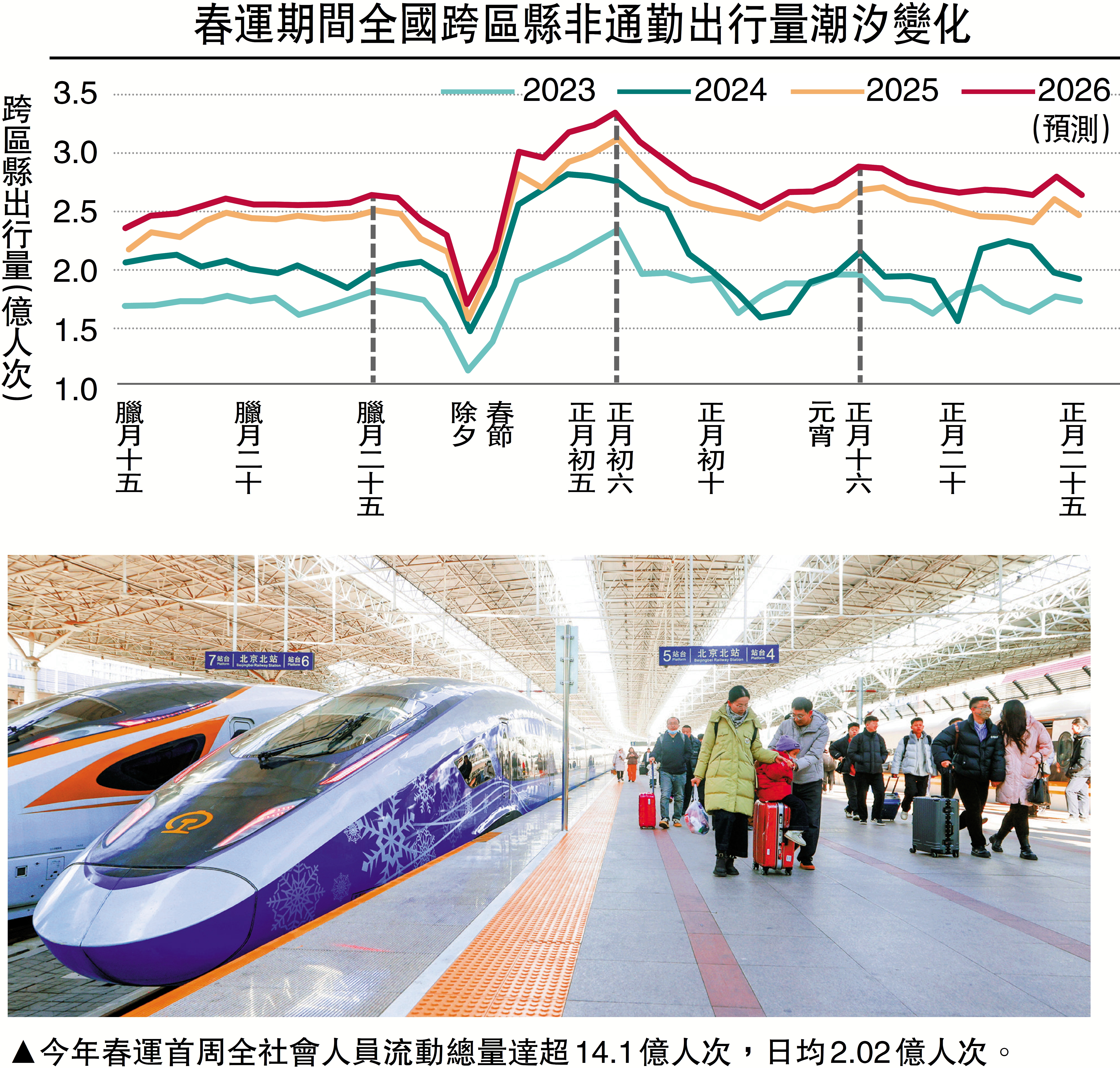 據中國交通運輸部預測,今年春運40天全社會人員流動總量有望創歷史新高,同時單日人員流動量峰值也可能刷新新紀錄。官方數據顯示,春運首周(2月8日)流動量達超14.1億人次,日均2.02億人次,預計整個春運40天(2月2日至3月13日)將達到95億人次,較2025年春運同比增長5%。